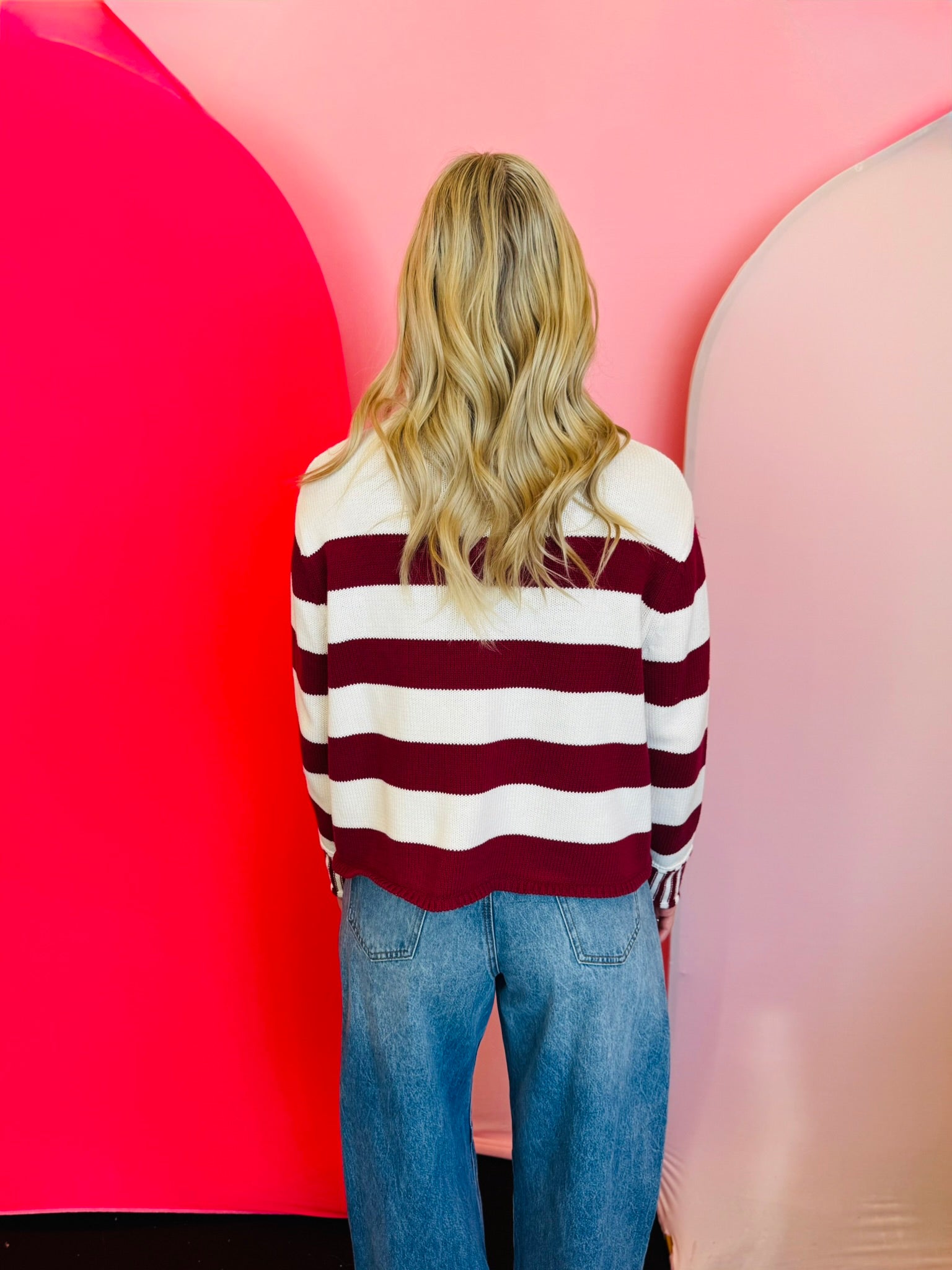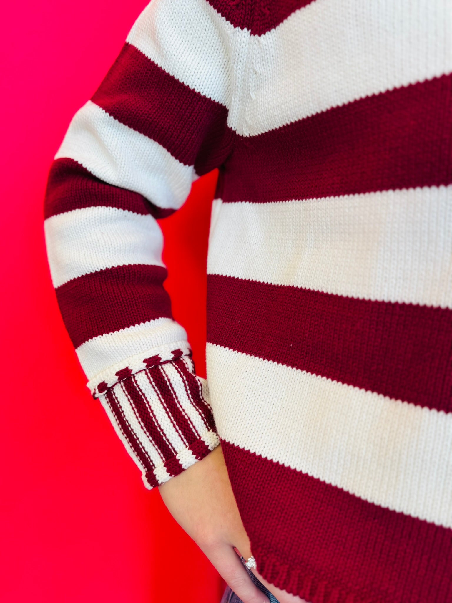 Make a stylish statement this season with our Cabernet Striped Sweater, a bold and cozy must-have designed for effortless everyday wear. Crafted from 100% cotton, this soft knit sweater features wide cabernet stripes paired with contrasting striped cuffs for a modern, elevated twist on a classic look. The boxy fit creates a relaxed, flattering silhouette, while the crew neckline adds a timeless touch that layers beautifully under jackets or stands strong on its own. With a total body length of approximately 21" and a 47" chest (measured from size small), it's the perfect blend of comfort and contemporary style. Whether you're dressing for casual outings, workdays, or cozy weekends, this striped sweater delivers the ideal mix of warmth, softness, and standout design.