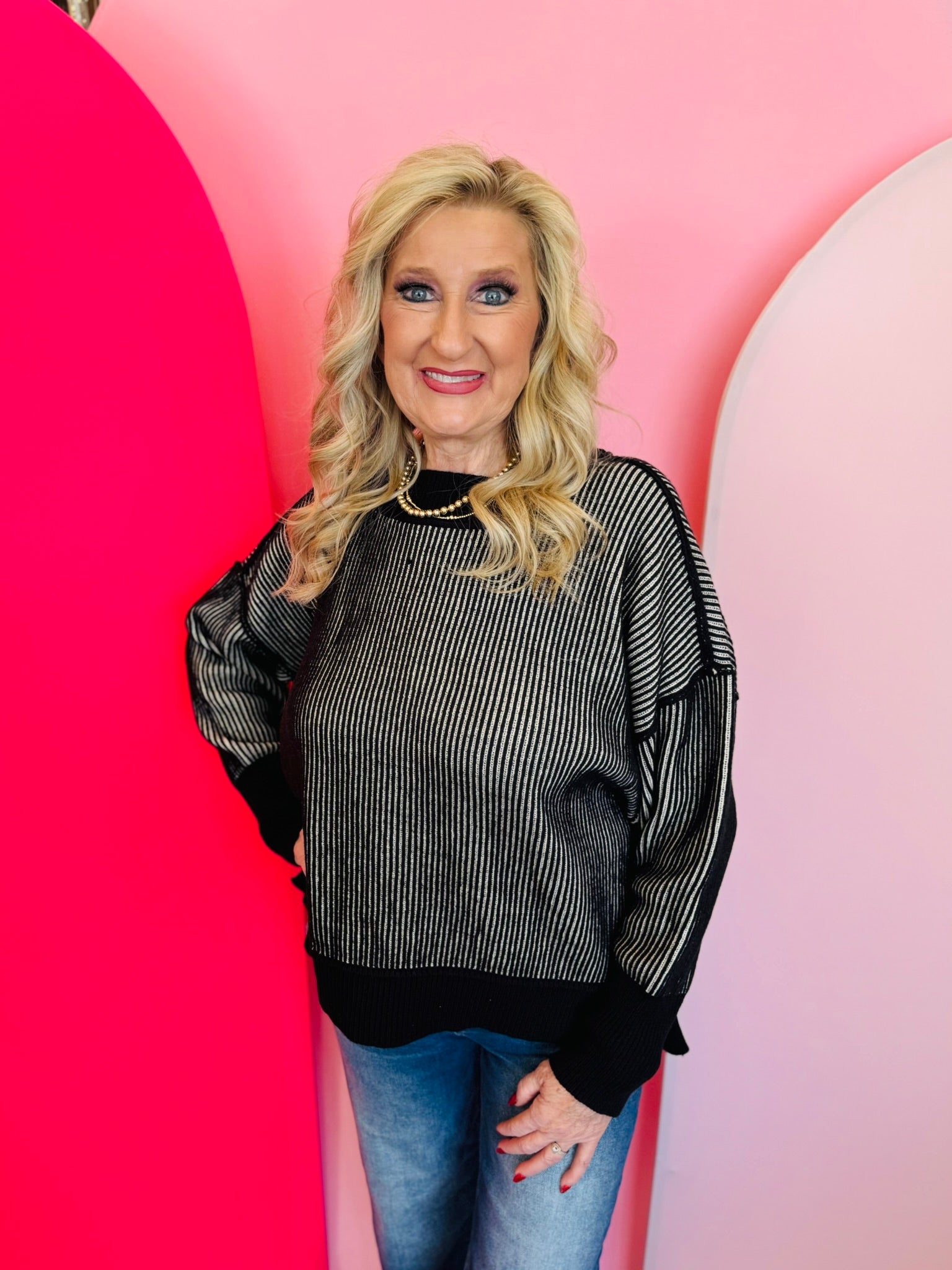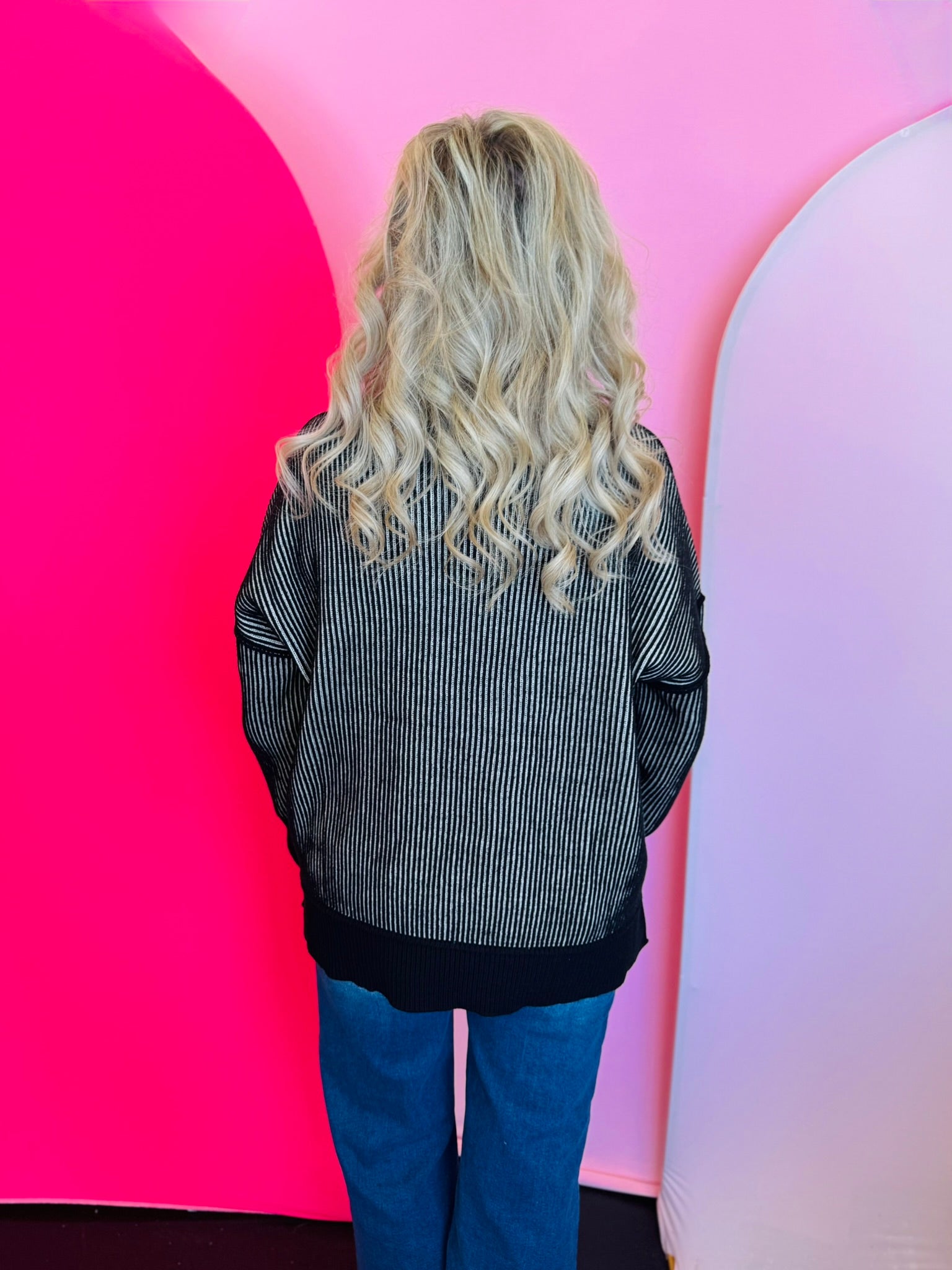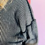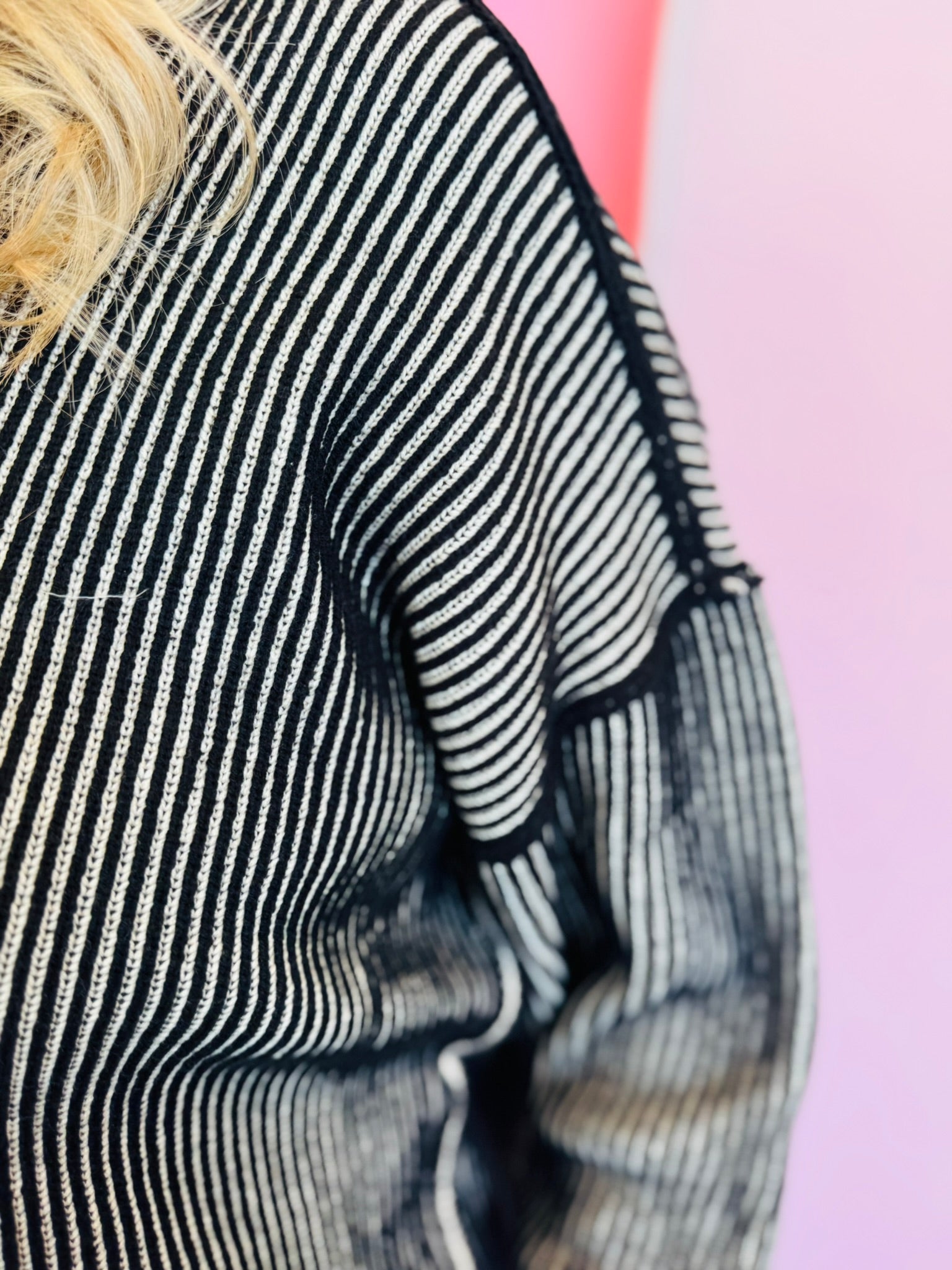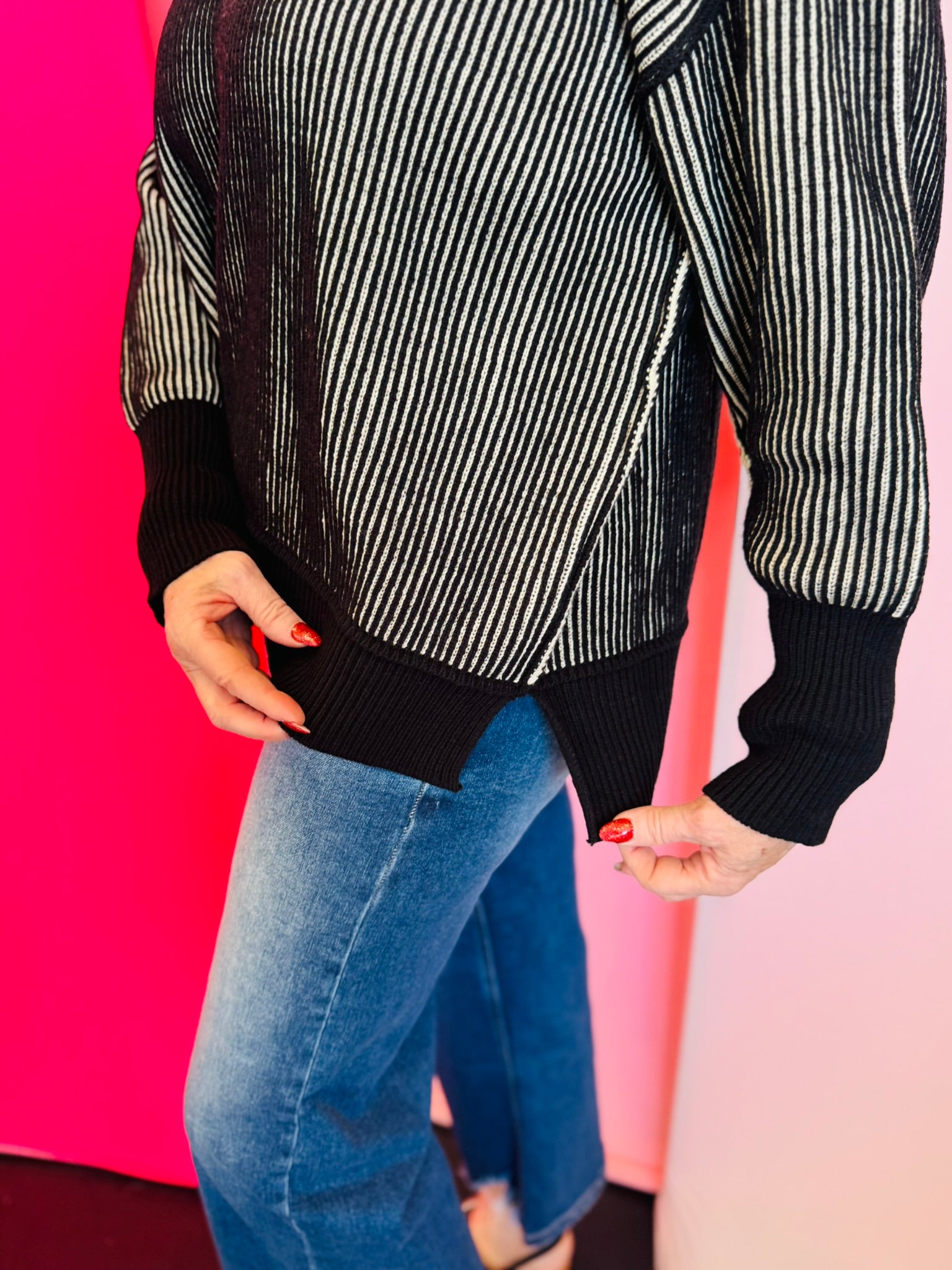 Elevate your style with our Black & White Two-Tone Sweater. This cozy piece features a bold striped knit with striking exposed seams, adding a modern, edgy touch to the design. It has a relaxed fit with dropped shoulders and a fashionable hi-low hem with side slits, creating a comfortable, laid-back silhouette. With its contrasting ribbed trim, this sweater is perfect for staying warm while looking effortlessly chic.