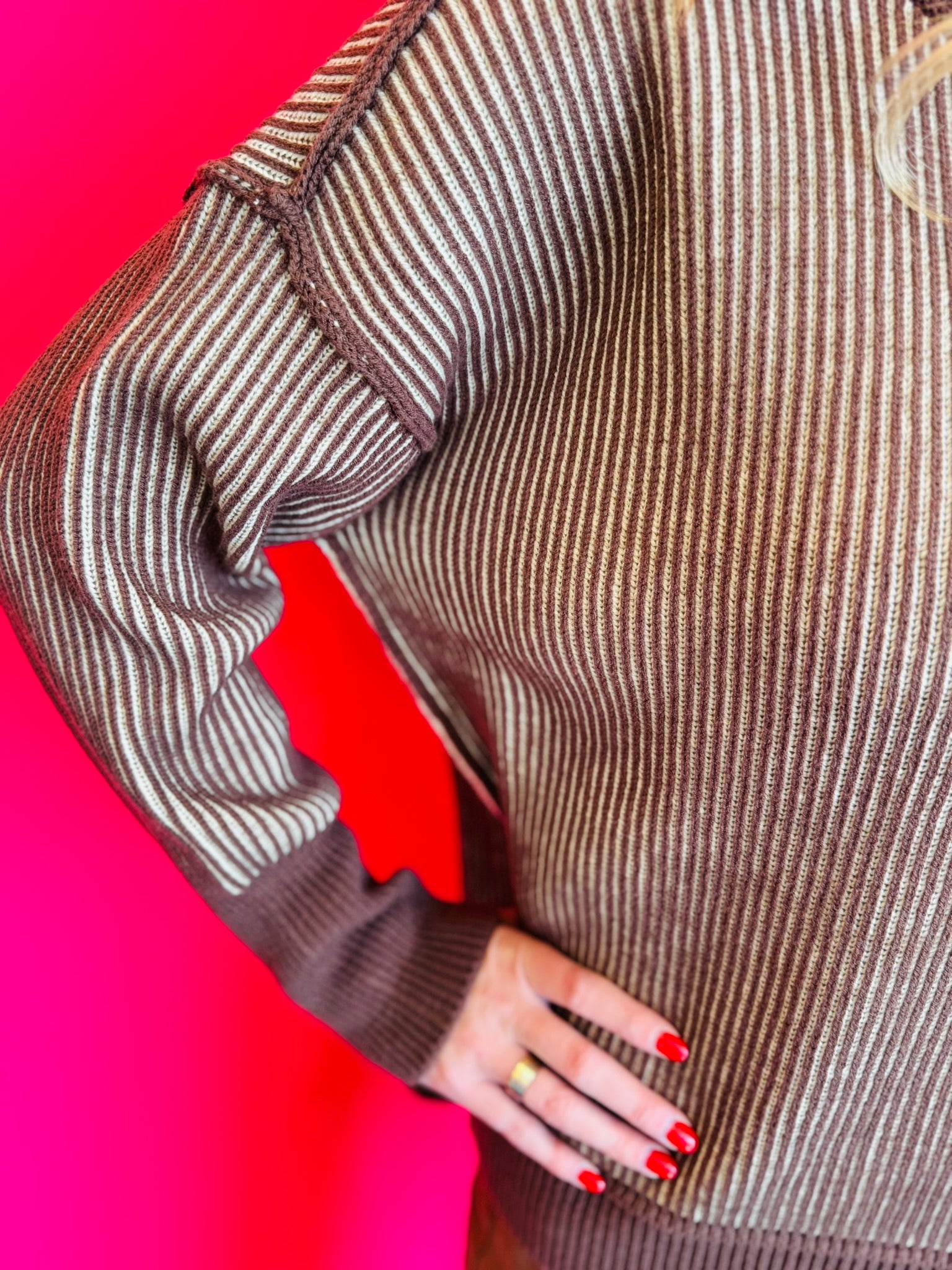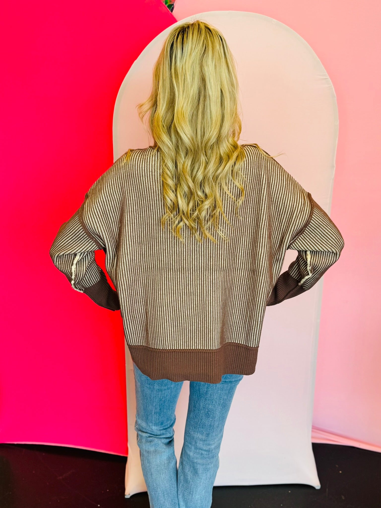Elevate your style with our Brown & White Two-Tone Sweater. This cozy piece features a bold striped knit with striking exposed seams, adding a modern, edgy touch to the design. It has a relaxed fit with dropped shoulders and a fashionable hi-low hem with side slits, creating a comfortable, laid-back silhouette. With its contrasting ribbed trim, this sweater is perfect for staying warm while looking effortlessly chic.
