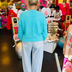 Brighten your day with the breezy comfort of our Turquoise Brushed Hacci Sweater. Soft, airy, and irresistibly cozy, this long-sleeve top is made from a plush brushed hacci knit that feels gentle against the skin while still offering lightweight warmth. The relaxed shape gives you a naturally easy fit, and the exposed outer seams add a touch of casual texture that sets this sweater apart. A square back patch brings a subtle hint of character and craftsmanship. The vibrant turquoise shade delivers a refreshing pop of color — lively, cheerful, and perfect for adding a little lift to your everyday outfits. Effortless, flattering, and endlessly comfortable, this sweater is a go-to for laid-back style.
