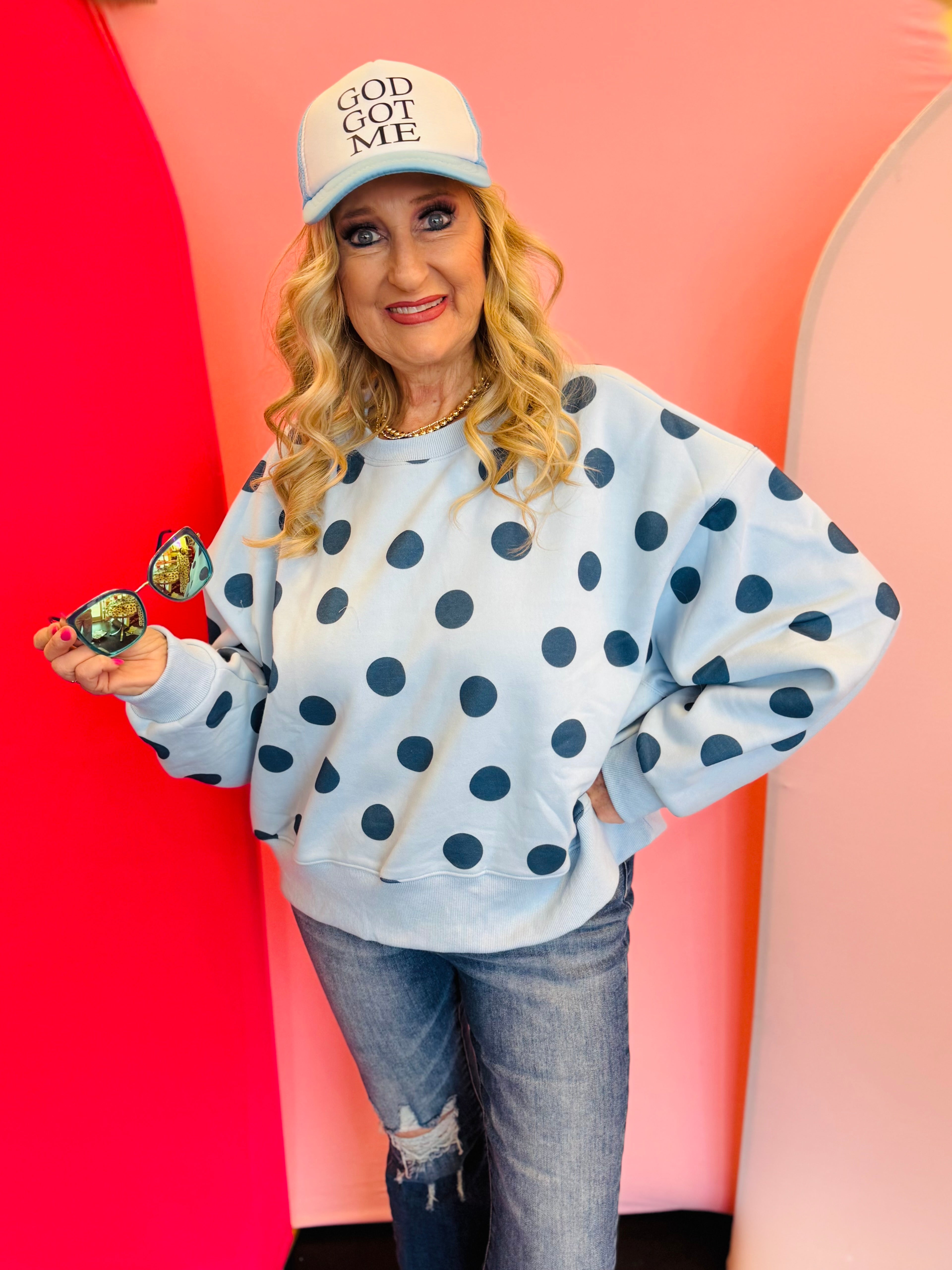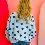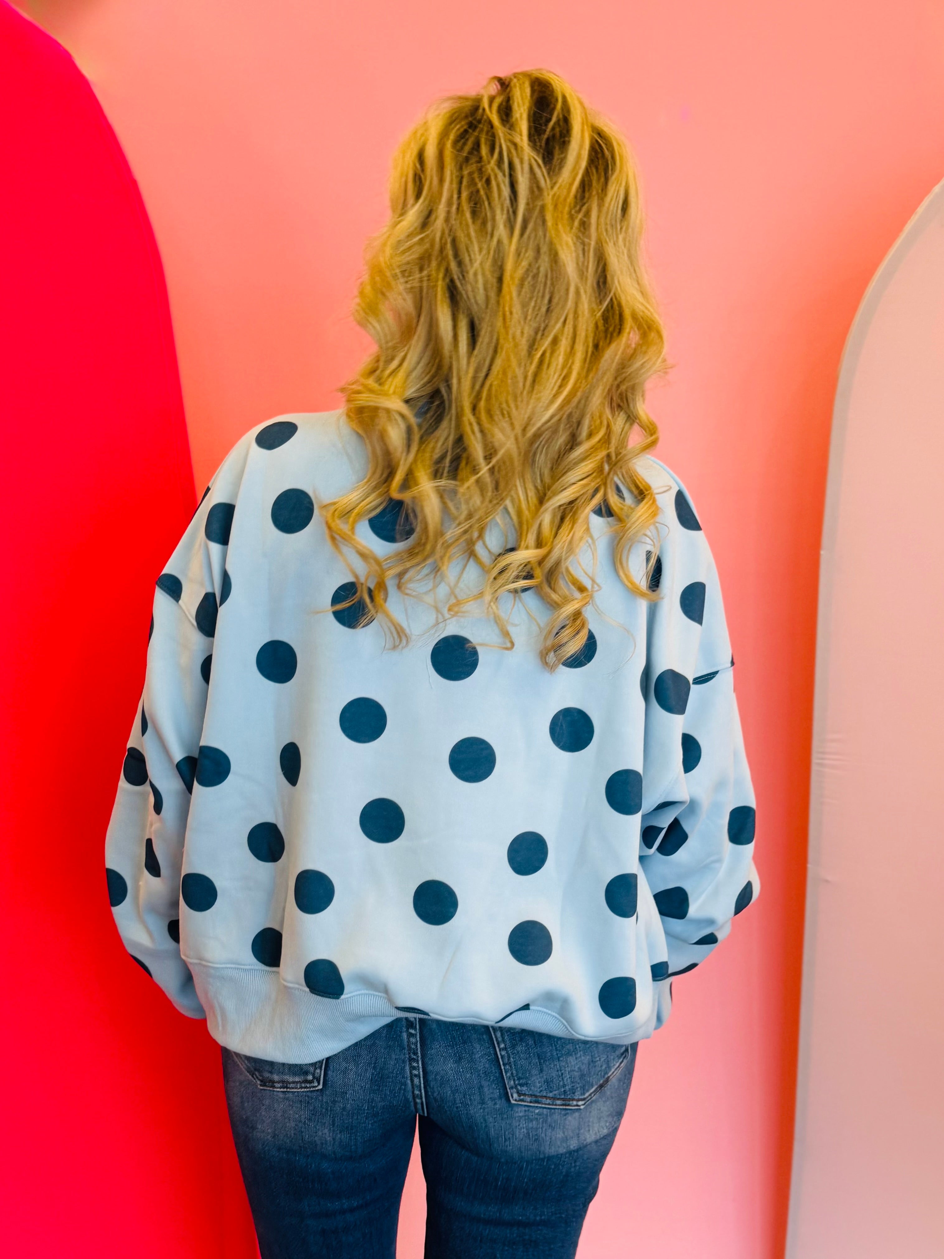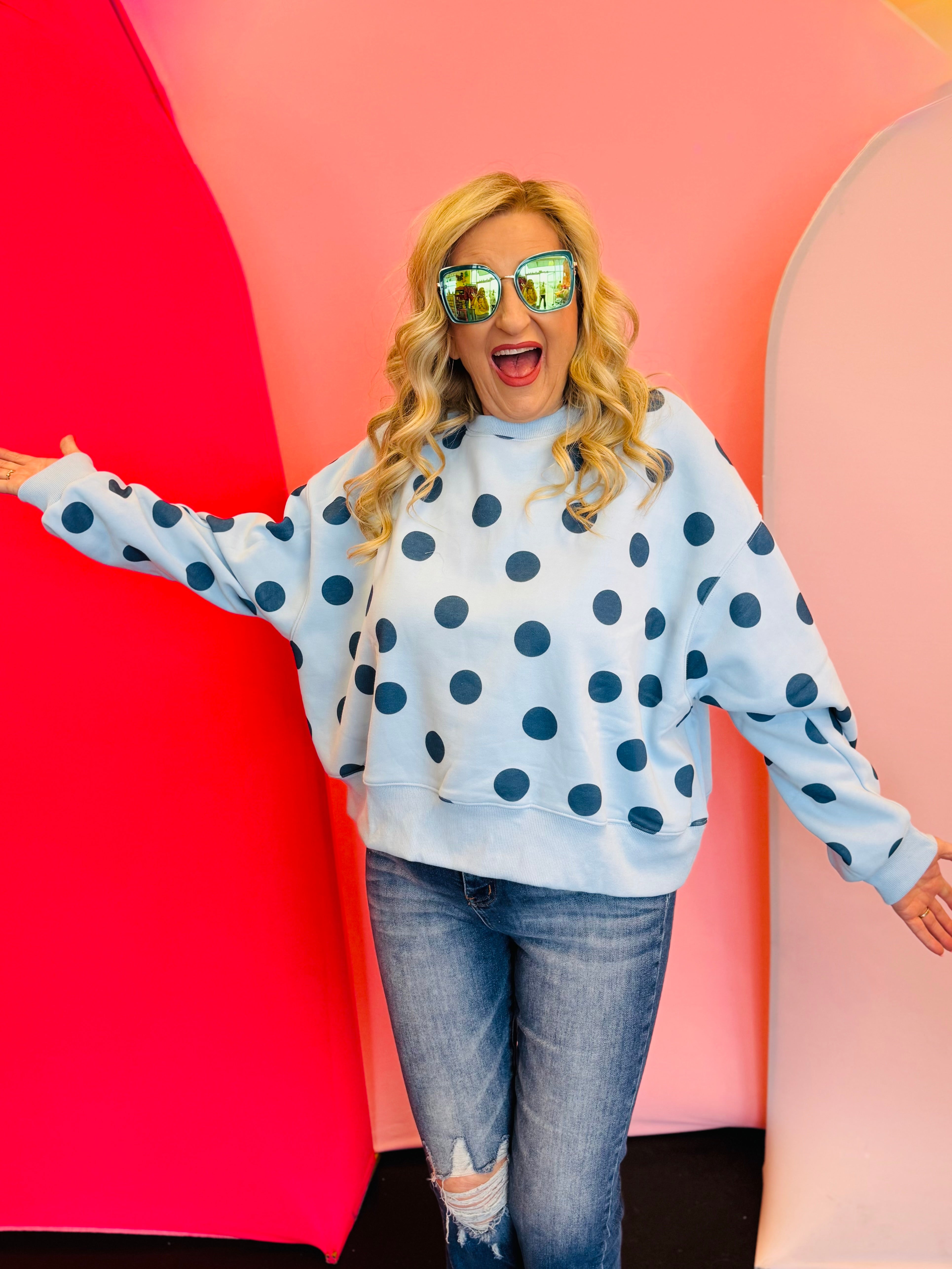 Classic, cozy, and effortlessly cute, our Blue Polka Dot Sweatshirt is a timeless staple with subtle, playful charm. Featuring a soft blue base accented with dark blue polka dots, this sweatshirt offers a monochromatic look that feels elevated yet easy to wear. The tonal polka dot pattern adds visual interest while remaining versatile for everyday styling.