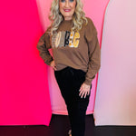 Celebrate fall in cozy style with the Gobble Sparkle Sweatshirt, the perfect blend of comfort, shimmer, and seasonal charm. Crafted from a soft 50% cotton, 50% polyester blend, this sweatshirt features a mocha brown base that beautifully highlights the mixed plaid and sequin patch letters spelling out “GOBBLE” in gold, black, and beige autumn tones.