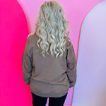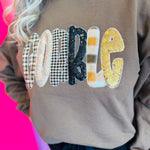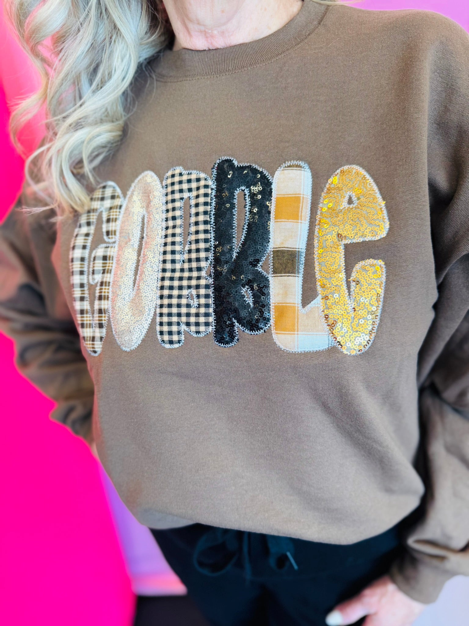 Mocha sweatshirt with plaid and sequin “GOBBLE” letters in warm gold, black, and beige.