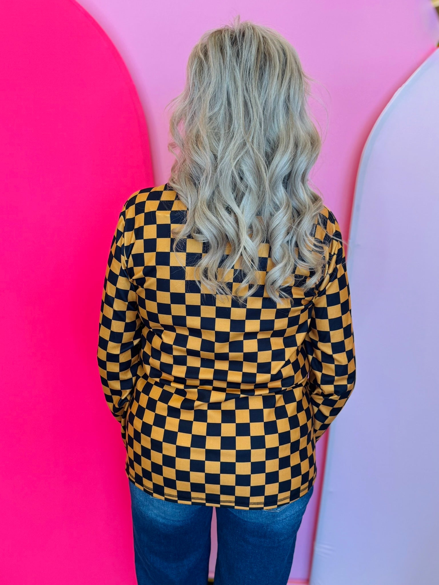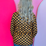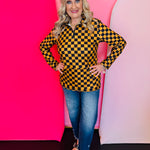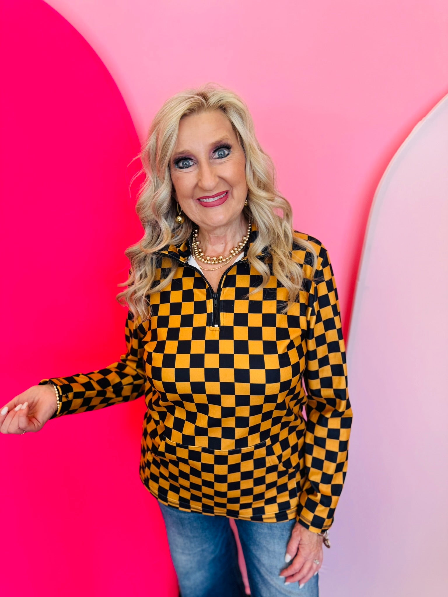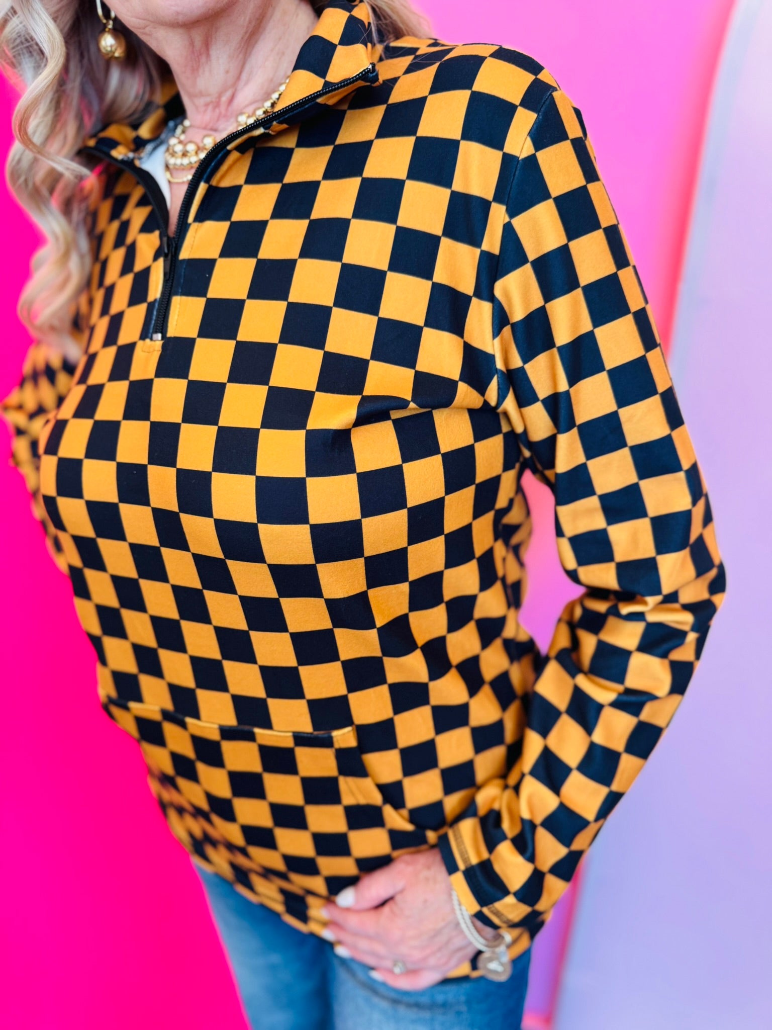 Make a bold statement in our Gold & Black Checkered Quarter-Zip Pullover, designed for comfort, style, and everyday flair. Featuring a striking gold and black checkered pattern, this pullover adds instant personality to your casual wardrobe. The soft and stretchy blend of cotton, rayon, and spandex creates a relaxed, comfortable fit that moves with you throughout the day. A collared neckline and quarter-zip front lend a sporty-chic touch, while the kangaroo front pocket keeps essentials close and hands warm. Effortless to layer and easy to wear, this pullover blends standout design with practical comfort—perfect for errands, lounging, or adding a pop of pattern to your everyday look.