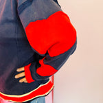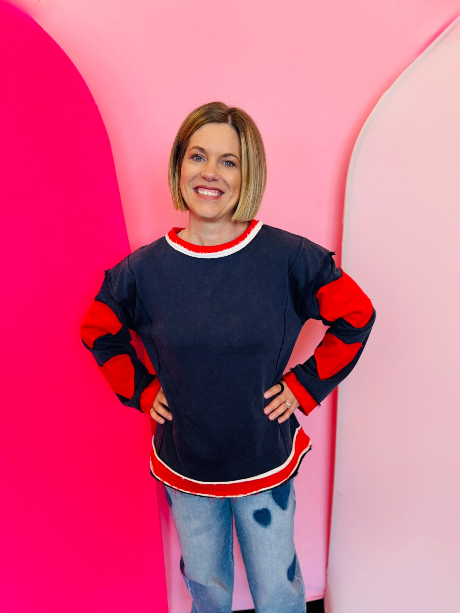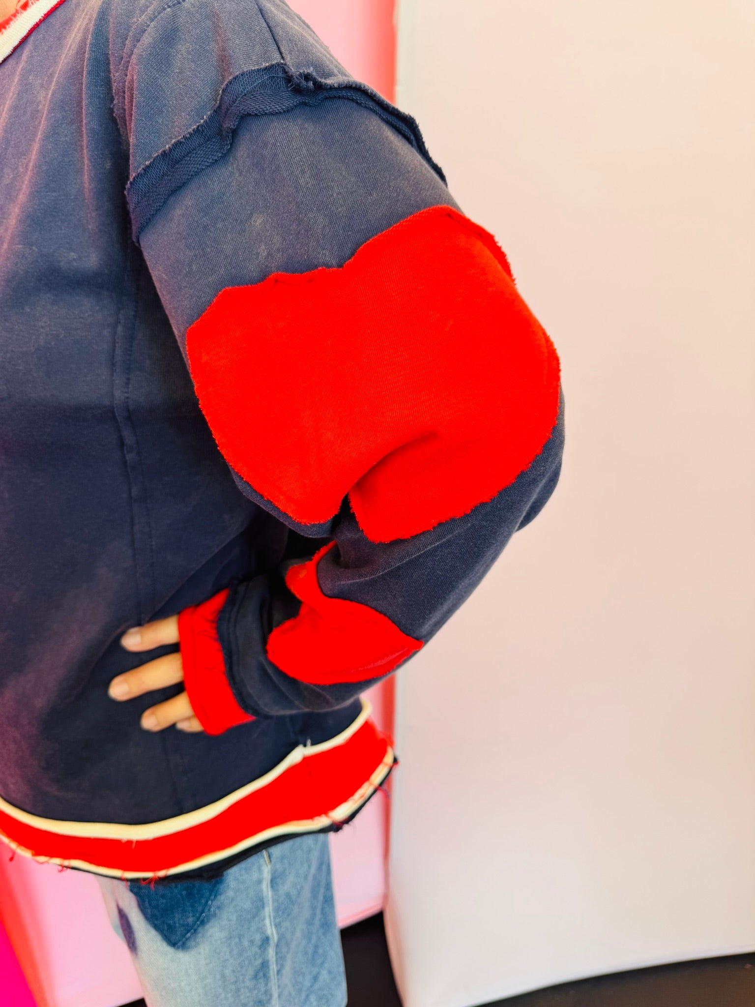 Navy pullover with red heart elbow patches, raw cut edges, and contrast neckline and hem.
