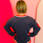 Show off your casual charm with the Navy Heart Patched Top, a cozy pullover that combines playful accents with laid-back style. Designed with a drop-shoulder silhouette and loose, relaxed fit, this top is perfect for everyday wear while keeping comfort front and center. The standout detail is the bold red heart patches on the elbows, adding a fun, love-inspired twist to a classic navy base. A red-and-white contrast neckline and hem highlight its sporty, casual vibe, while raw cut edge accents bring a touch of modern edge. Crafted from a soft and durable blend of 85% cotton and 15% polyester, this top is breathable, lightweight, and easy to wear year-round. Pair it with jeans or leggings for a casual, playful look that still feels polished.