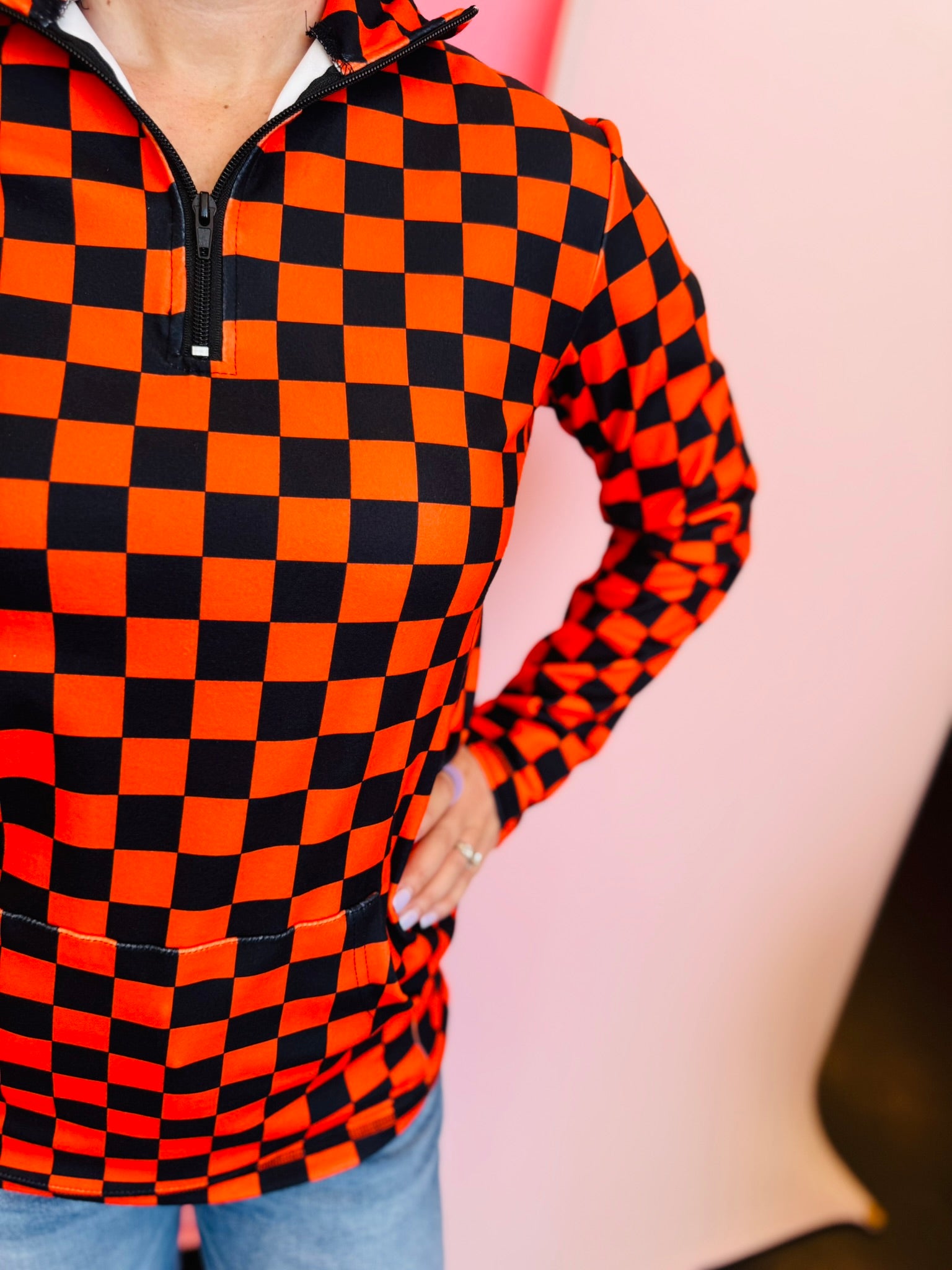 Stay warm and stylish in our Orange & Black Checkered Quarter-Zip Pullover, designed to bring bold personality to your everyday wardrobe. Featuring a striking orange and black checkered print, this pullover adds a vibrant pop of color and pattern to any casual look. The soft, stretchy blend of cotton, rayon, and spandex creates a relaxed, comfortable fit that’s perfect for layering. A collared neckline and quarter-zip front give it a polished, sporty-chic finish, while the kangaroo pocket adds both function and cozy appeal. Whether you’re heading out for errands, meeting friends, or enjoying a laid-back day at home, this pullover delivers the perfect mix of standout style and effortless comfort.