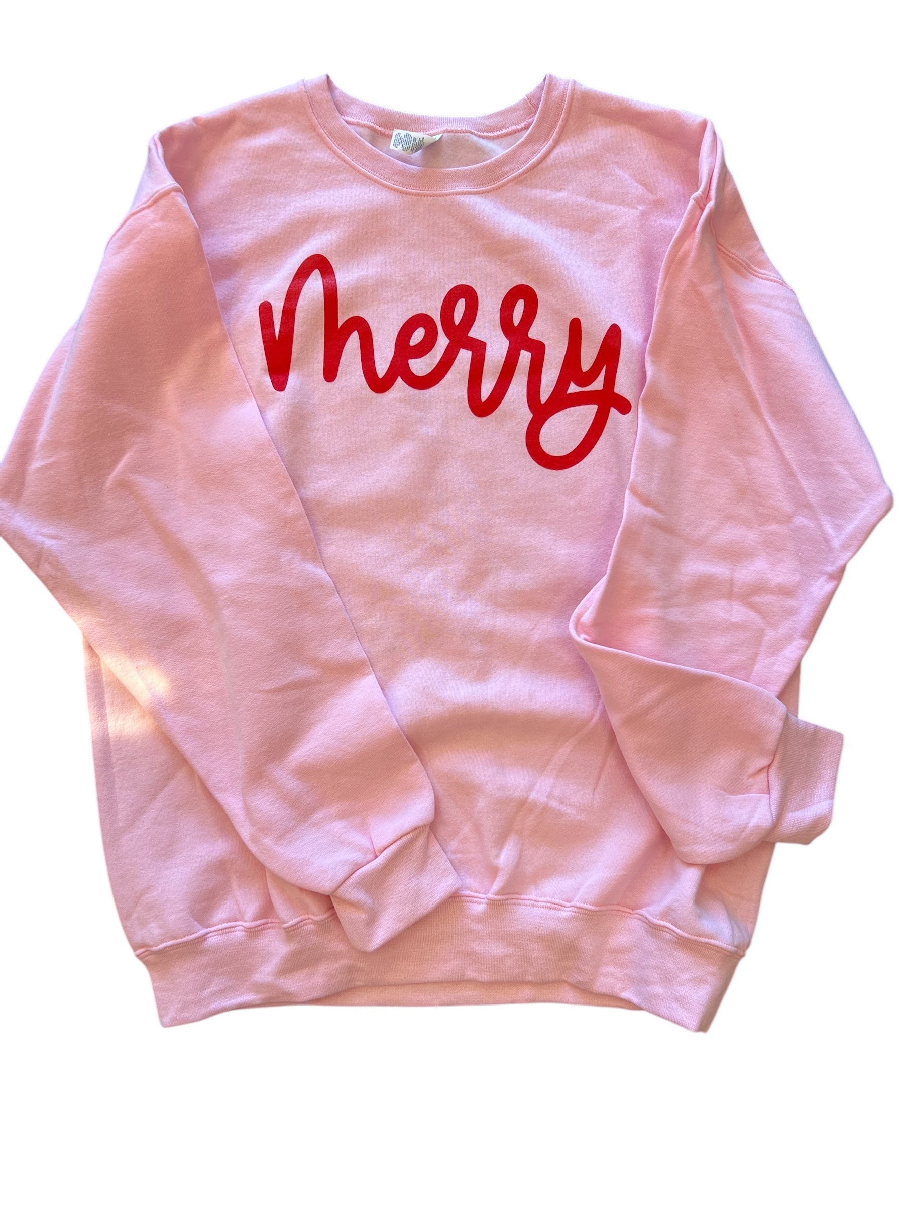 Soft pink sweatshirt with bold red “Merry” script lettering in festive holiday style.