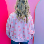 Pink sweatshirt with dark pink polka dots and relaxed dropped-shoulder fit.