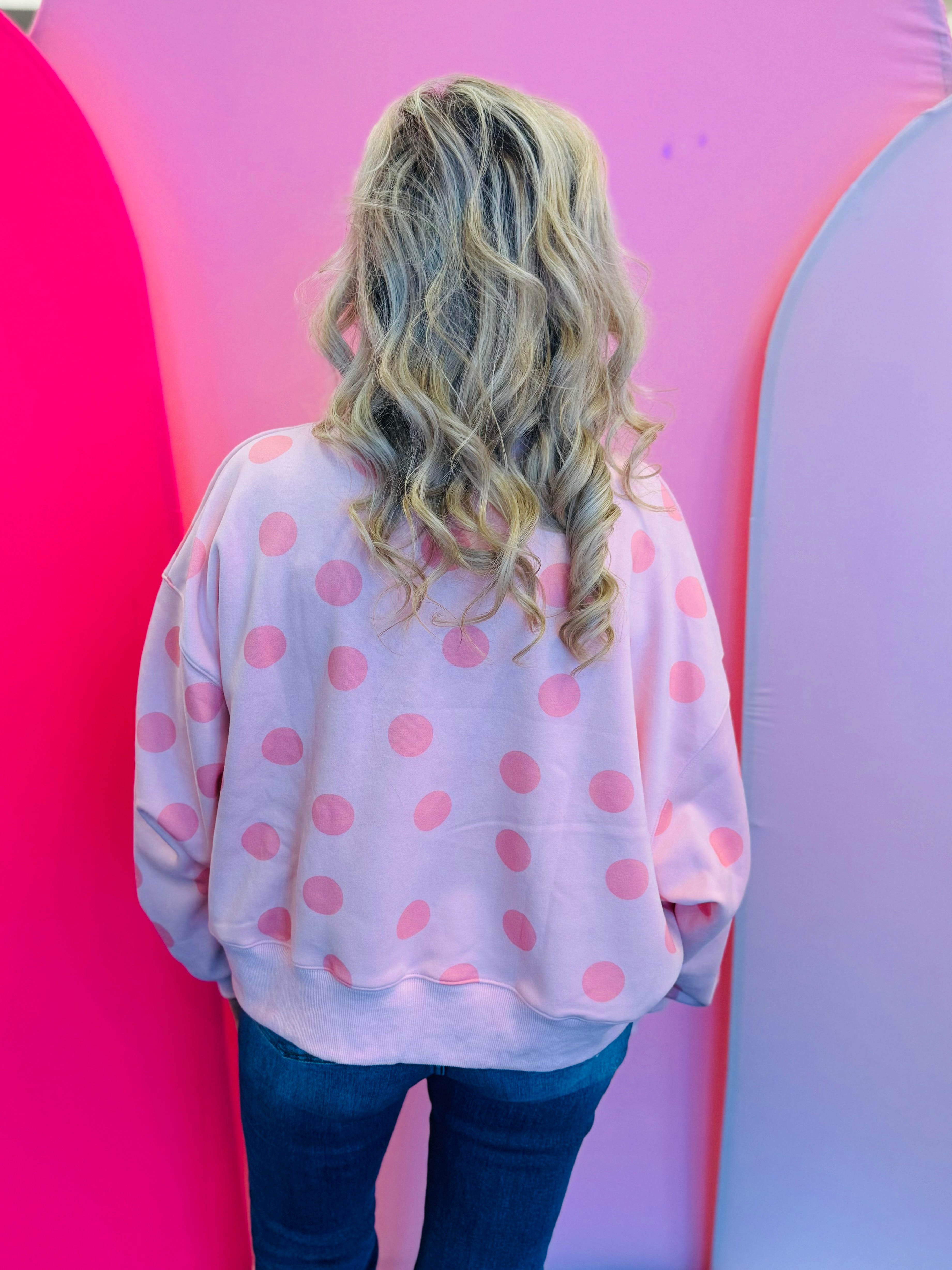 Classic, cozy, and effortlessly cute, our Pink Polka Dot Sweatshirt is a timeless staple with soft, playful charm. Featuring a pretty pink base accented with dark pink polka dots, this sweatshirt offers a tonal look that feels feminine, fun, and easy to wear. The monochromatic polka dot pattern adds subtle dimension while remaining versatile for everyday styling.