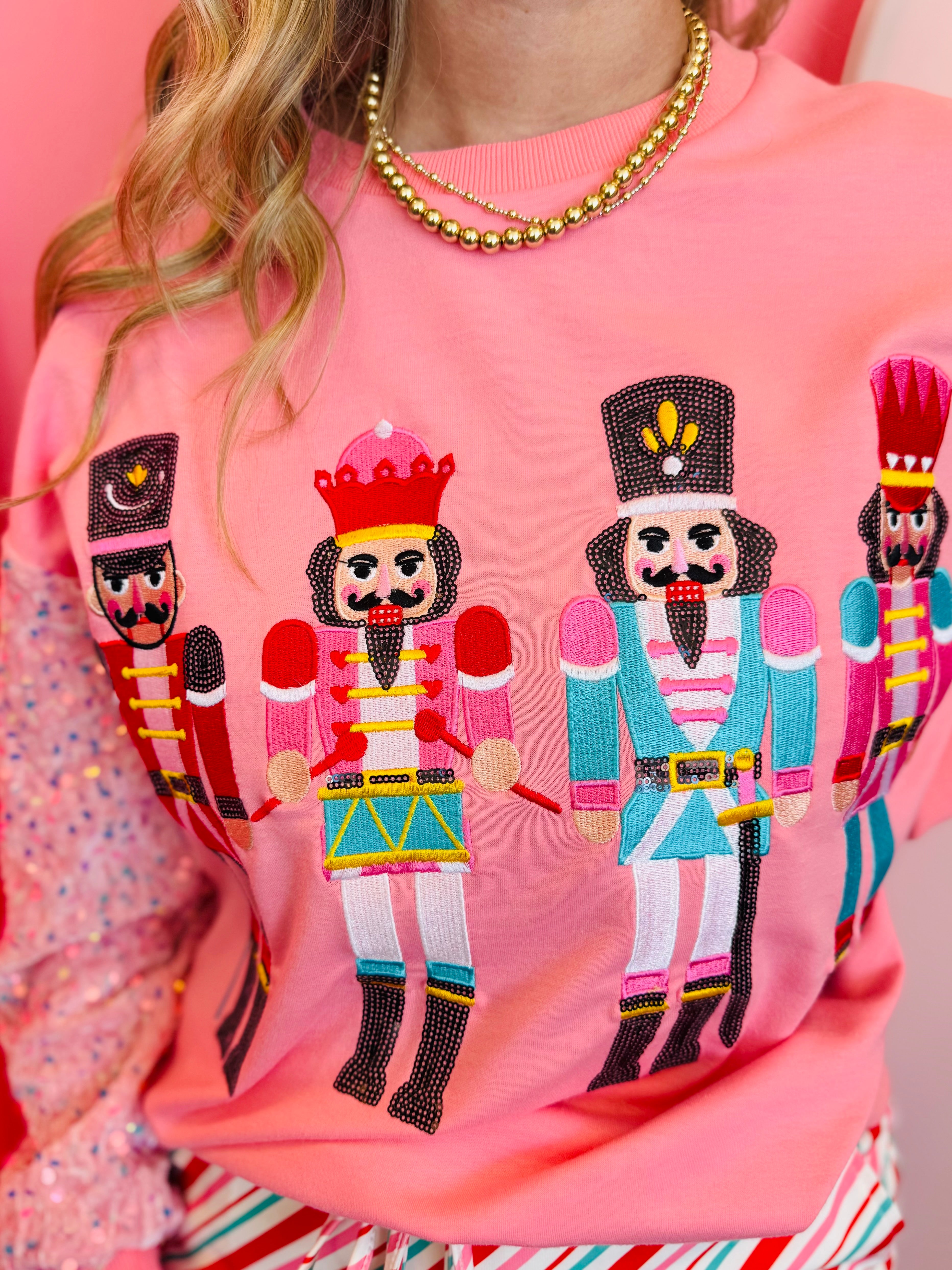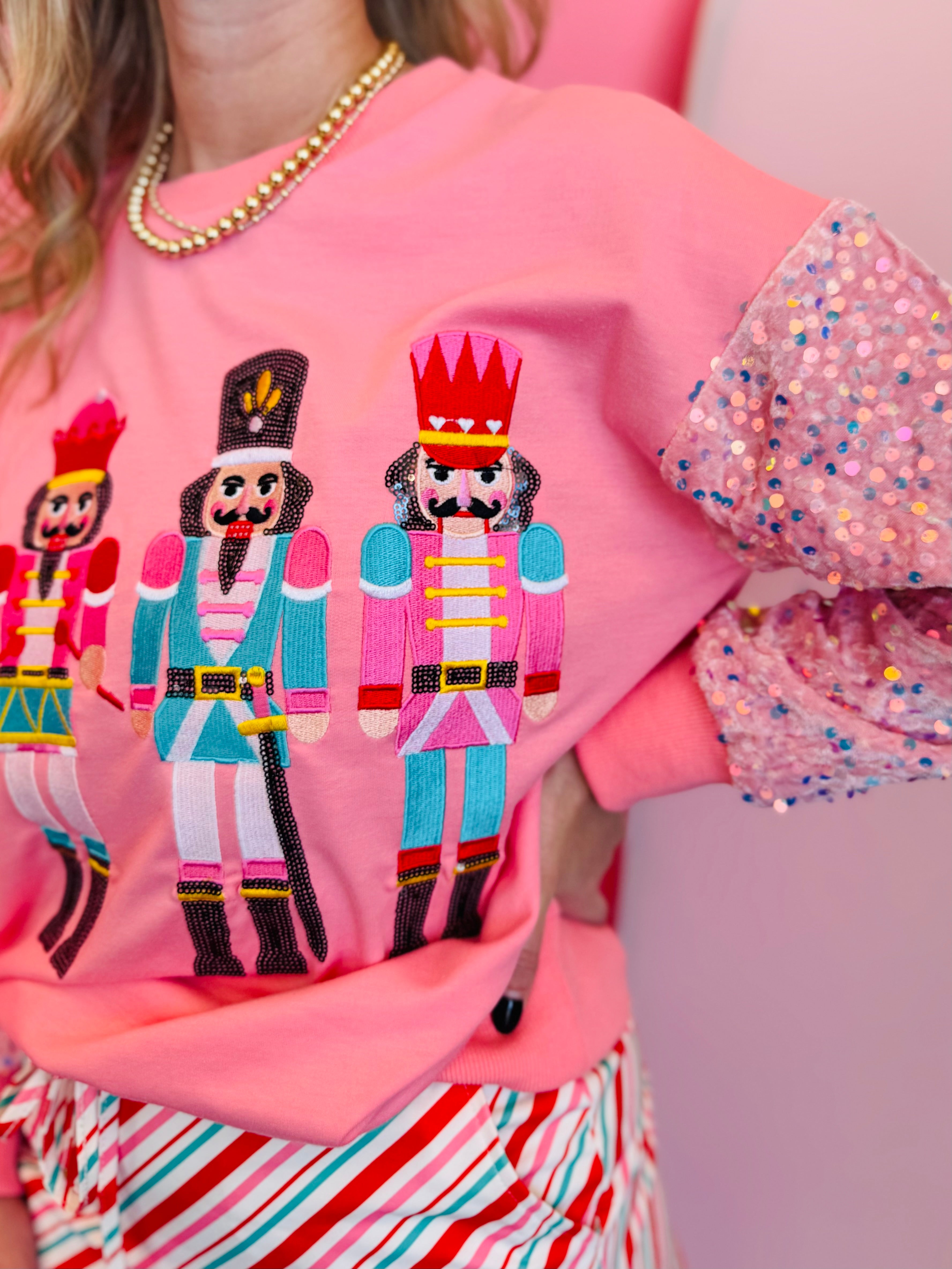 Festive nutcracker top with pink sequin sleeves, cozy knit fabric, and cheerful holiday sparkle.