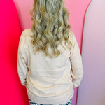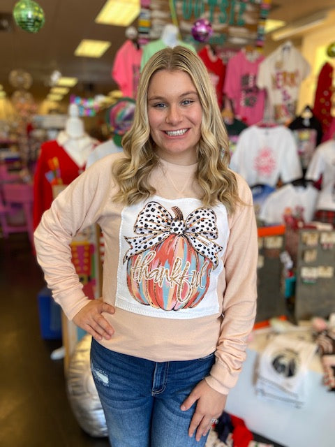 Embrace the autumn spirit with this beautifully designed top, featuring a light peachy beige base and a bold center patch that truly stands out. The patch showcases a whimsical pumpkin painted in warm tones of orange, blue, and cream, with the word "THANKFUL" elegantly written across it. Topped with a large black patterned bow outlined in gold accents, the design is enhanced by sparkling red rhinestones on the bow, adding a touch of glamour to your fall wardrobe. Whether you're celebrating Thanksgiving or simply enjoying the season, this top is the perfect combination of cozy and chic.