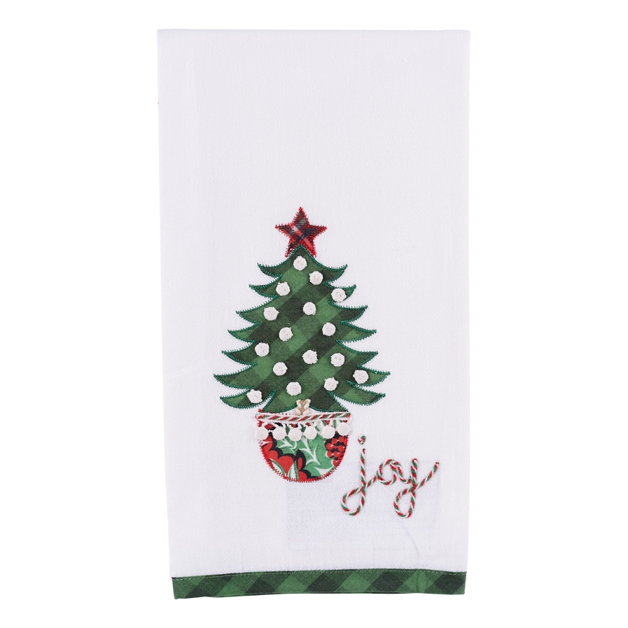 Embroidered Christmas tea towel with festive tree and red, white, and green “Joy” lettering.