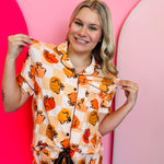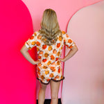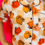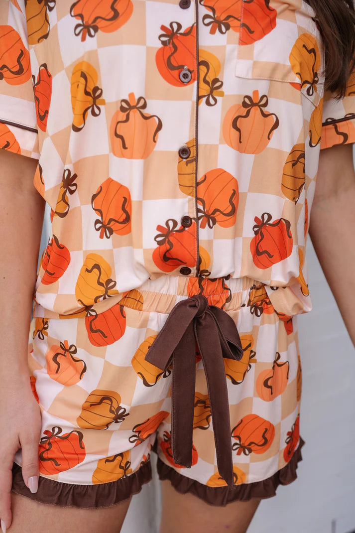 Drift off in festive charm with the Harvest Hues Ruffle Pajama Set. Designed for lounging and sleeping in style, this set combines soft fabric with playful seasonal details. The classic button-up top is easy to wear, while the ruffle-trimmed shorts with a decorative tie add a fun touch. Featuring a cheerful checkered and pumpkin print, these pajamas are perfect for cozy nights in or gifting. Made from a breathable blend, they provide a soft feel with the right amount of stretch.