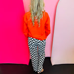 • Vibrant bright orange sweatshirt with black and white checkered pumpkin graphics