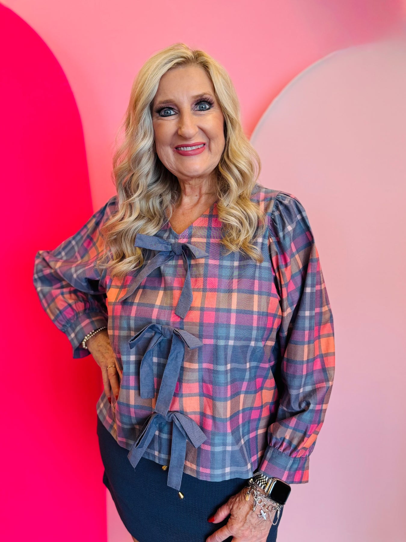 Celebrate the season in timeless style with our Betty Bow Top, a charming plaid blouse featuring delightful shades of pink and blue. This exquisite top blends vintage inspiration with a modern, festive twist, making it perfect for holiday parties, family gatherings, or cheerful everyday wear. Designed with three elegant bow accents down the front, it offers a unique and sophisticated detail. The long sleeves with gathered cuffs add a refined touch, enhancing its chic silhouette. The relaxed fit drapes beautifully and feels soft against the skin, ensuring comfort from morning shopping trips to evening celebrations.