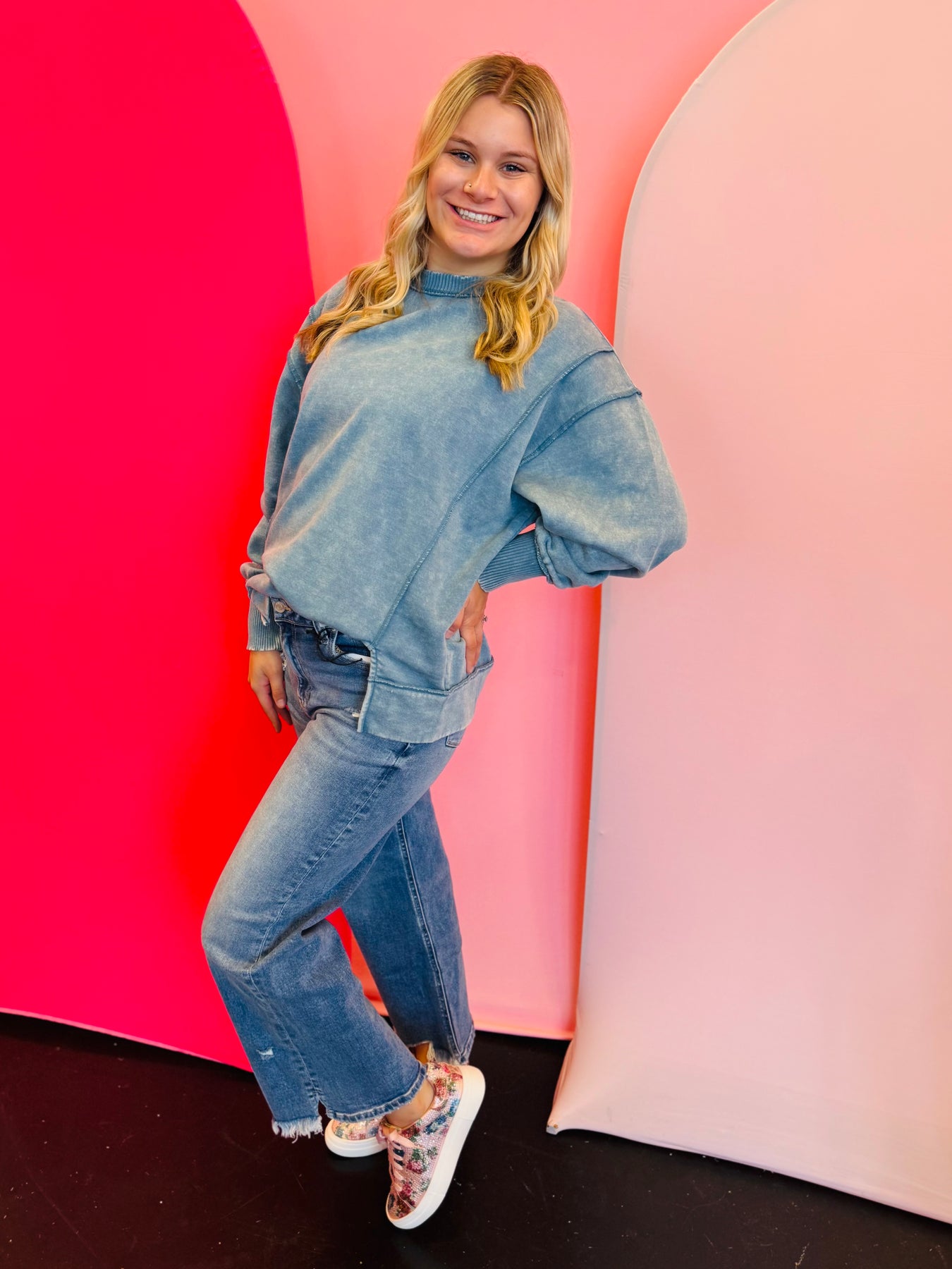 Stay cozy and effortlessly stylish with our Blue Grey Acid Wash Bottom Band Exposed-Seam Fleece Sweatshirt—a must-have for casual days, weekend errands, and on-trend loungewear looks. This sweatshirt combines comfort with an edgy, streetwear vibe. The blue grey acid wash finish creates a unique, vintage-inspired look, while exposed seam details add texture and dimension. A relaxed fit and side slits provide easy movement and a flattering drape, making it perfect to layer over leggings, biker shorts, or high-waisted jeans. With a total body length of 26.5" (front) and chest of 48" approx. (measured from Small), this sweatshirt delivers all-day comfort and a fashion-forward edge—ideal for lounging, travel, or everyday streetwear styling.
