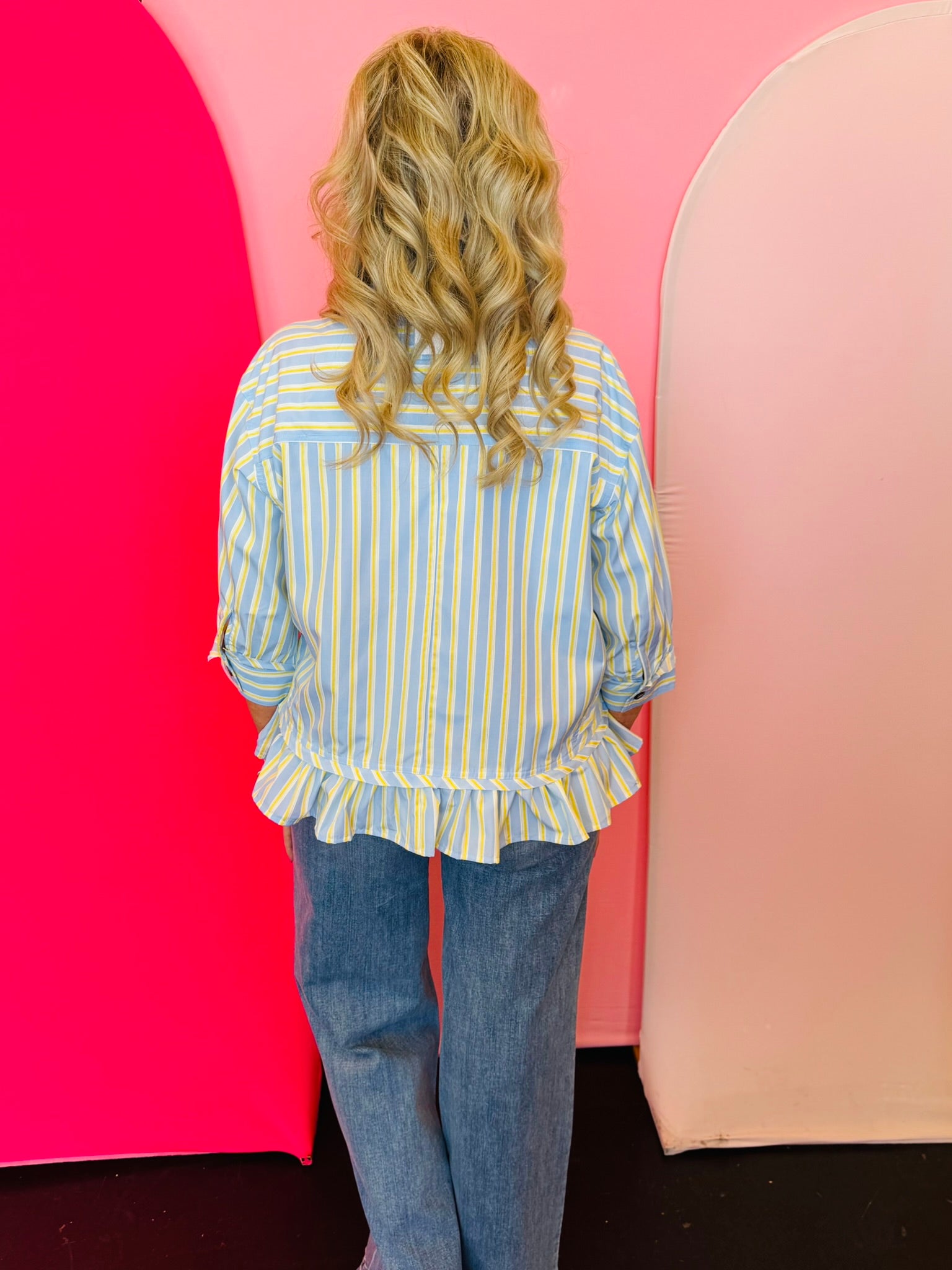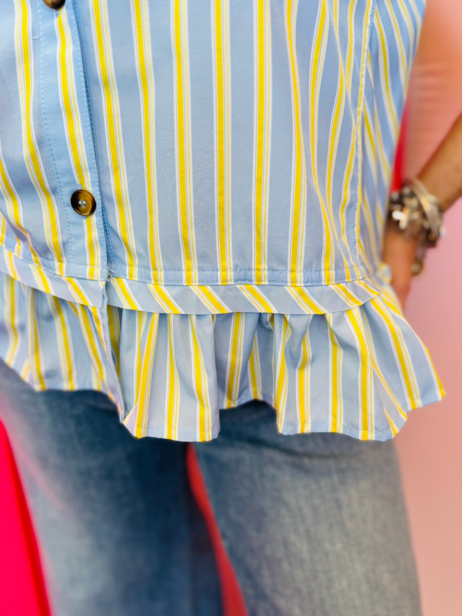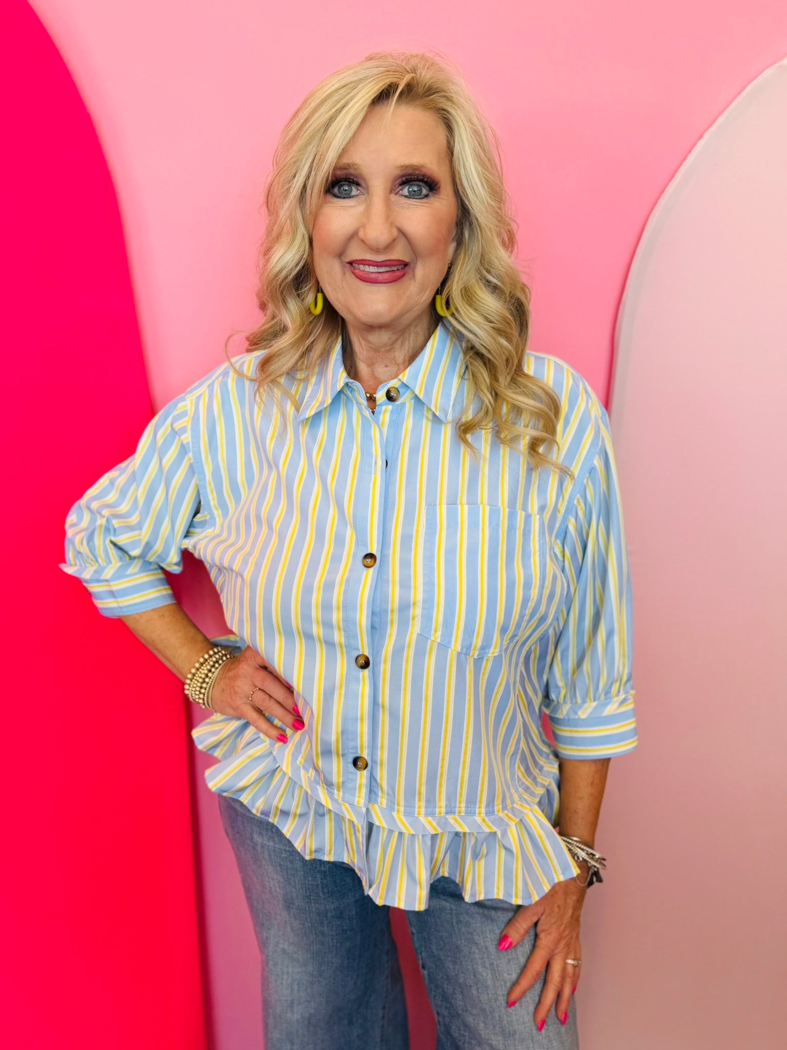 Designed in fresh blue and yellow stripes, this button-down blouse brings a cheerful pop of color while staying versatile enough for everyday styling. The collared neckline and functional button front create a timeless, tailored feel, while the relaxed fit keeps it comfortable and easy to move in.