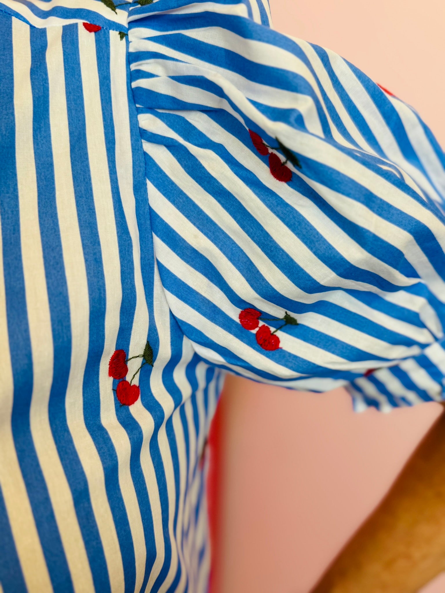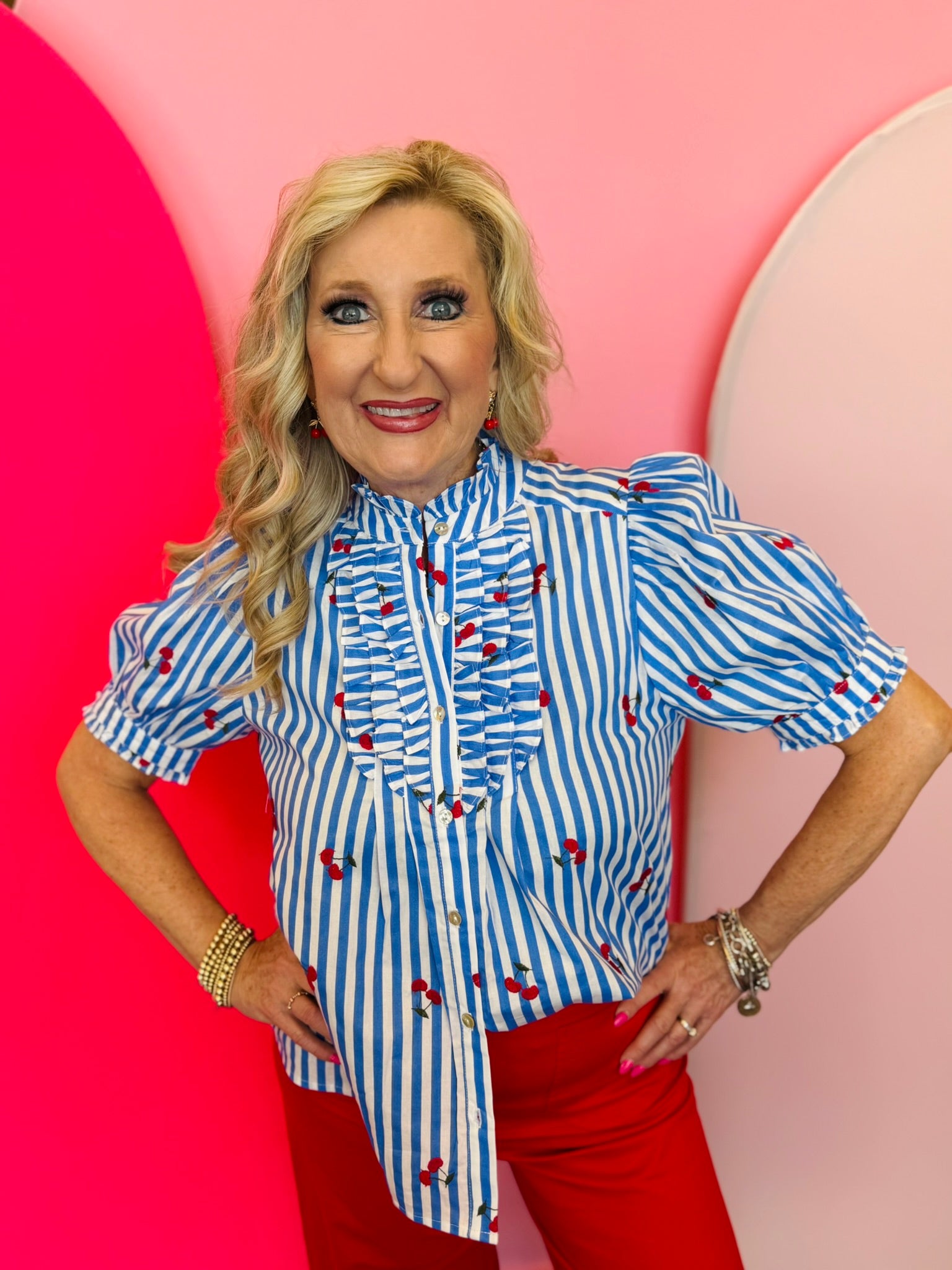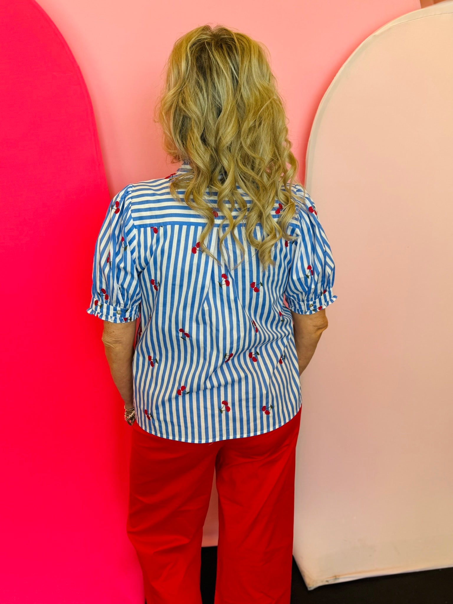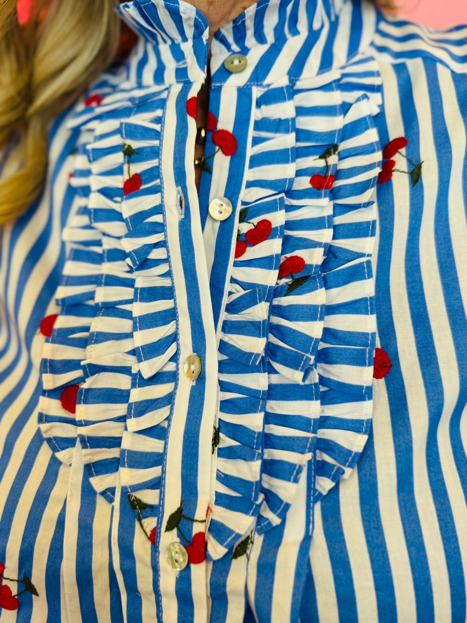 Designed with crisp blue and white vertical stripes, this lightweight cotton blouse features scattered cherry details that add a cheerful pop of personality. The ruffled mock neckline and front ruffle placket create a feminine, boutique-inspired look, while the button-front design keeps it timeless and easy to style.
