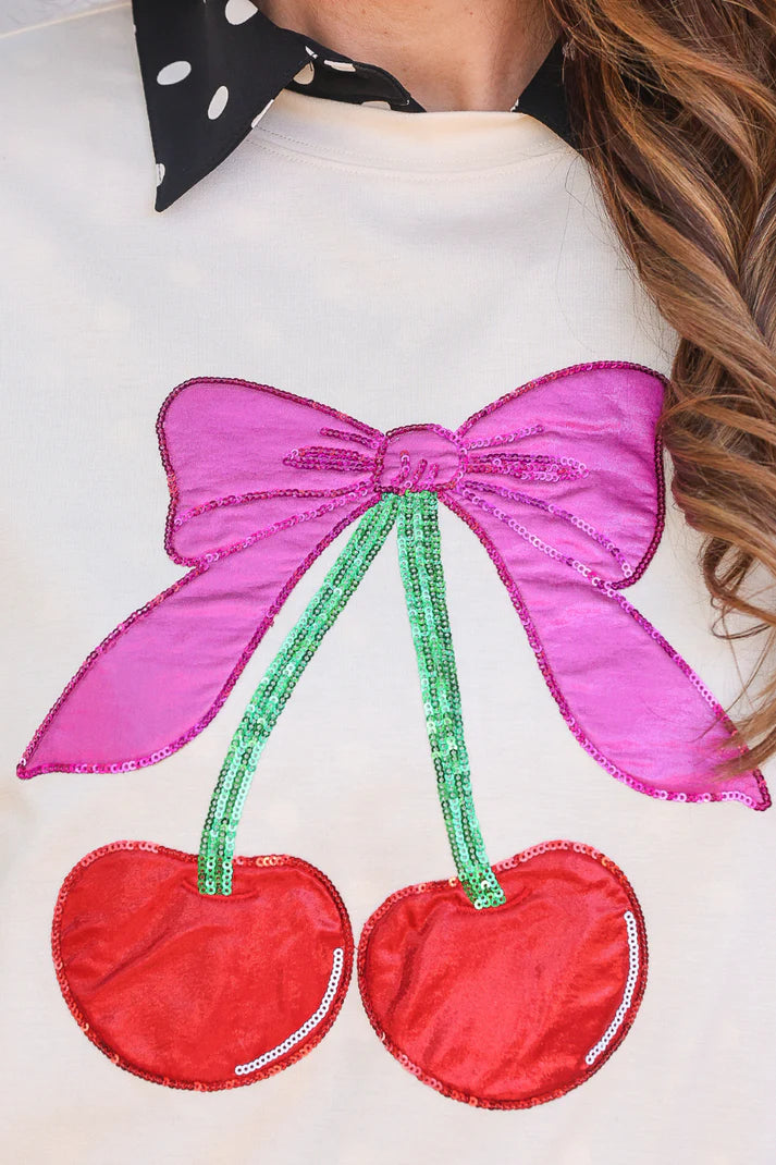 Cherry bow luxe pullover with foil cherry graphic and soft stretch fabric