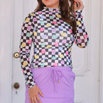 Fall in love with playful style in our Keigan Checkered Conversation Hearts Mesh Top, a sweet and trendy layering piece perfect for Valentine’s season and beyond. Crafted from a soft, stretchy blend of 95% rayon and 5% spandex, this sheer mesh top features a classic checkered base adorned with colorful conversation hearts that add charm and personality to any outfit. The mock neckline creates a polished, elevated look, while the delicate lettuce hems bring a soft, feminine touch. Lightweight and breathable, this top is perfect for layering under graphic tees, pairing with vests and cardigans, styling over bralettes, or adding a fun twist to denim and skirts. Whether you're dressing for a themed event, a night out, or simply love expressive fashion, this mesh top is a must-have statement piece.