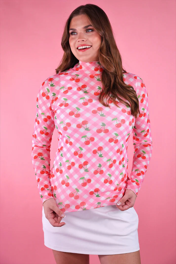 Add a dose of playful charm to your wardrobe with our Keigan Cherry Picnic Mesh Top, a trendy and versatile layering piece designed for standout style. Crafted from a soft, stretchy blend of 95% rayon and 5% spandex, this sheer mesh top features a fresh gingham print sprinkled with adorable cherry motifs, giving it the perfect mix of retro flair and modern sweetness. A chic mock neckline and delicate lettuce hems add polished, feminine details, making it easy to dress up or down. Layer it under graphic tees, pair it with jackets or cardigans, or style it solo over a bralette for a bold, fashion-forward look. Lightweight, breathable, and fun to wear, this top brings joyful energy to any outfit—ideal for spring, summer, concerts, or everyday trendsetting.