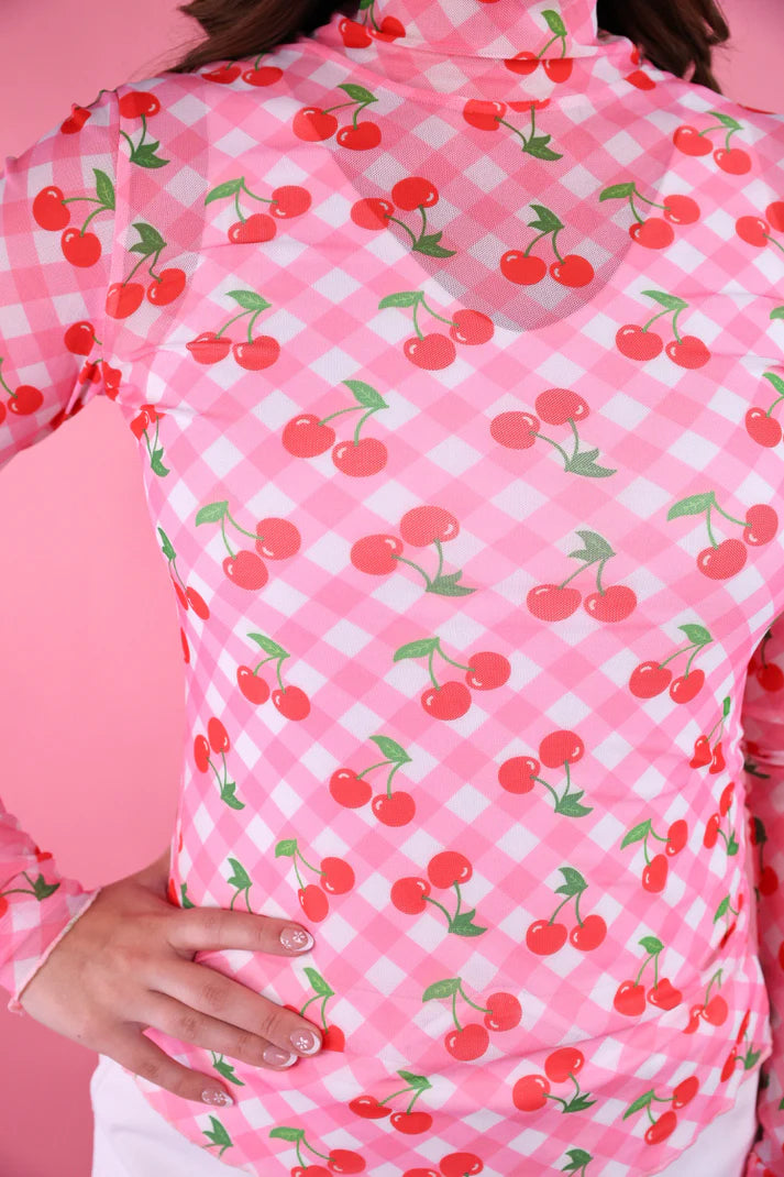 Sheer mesh with gingham + cherry print