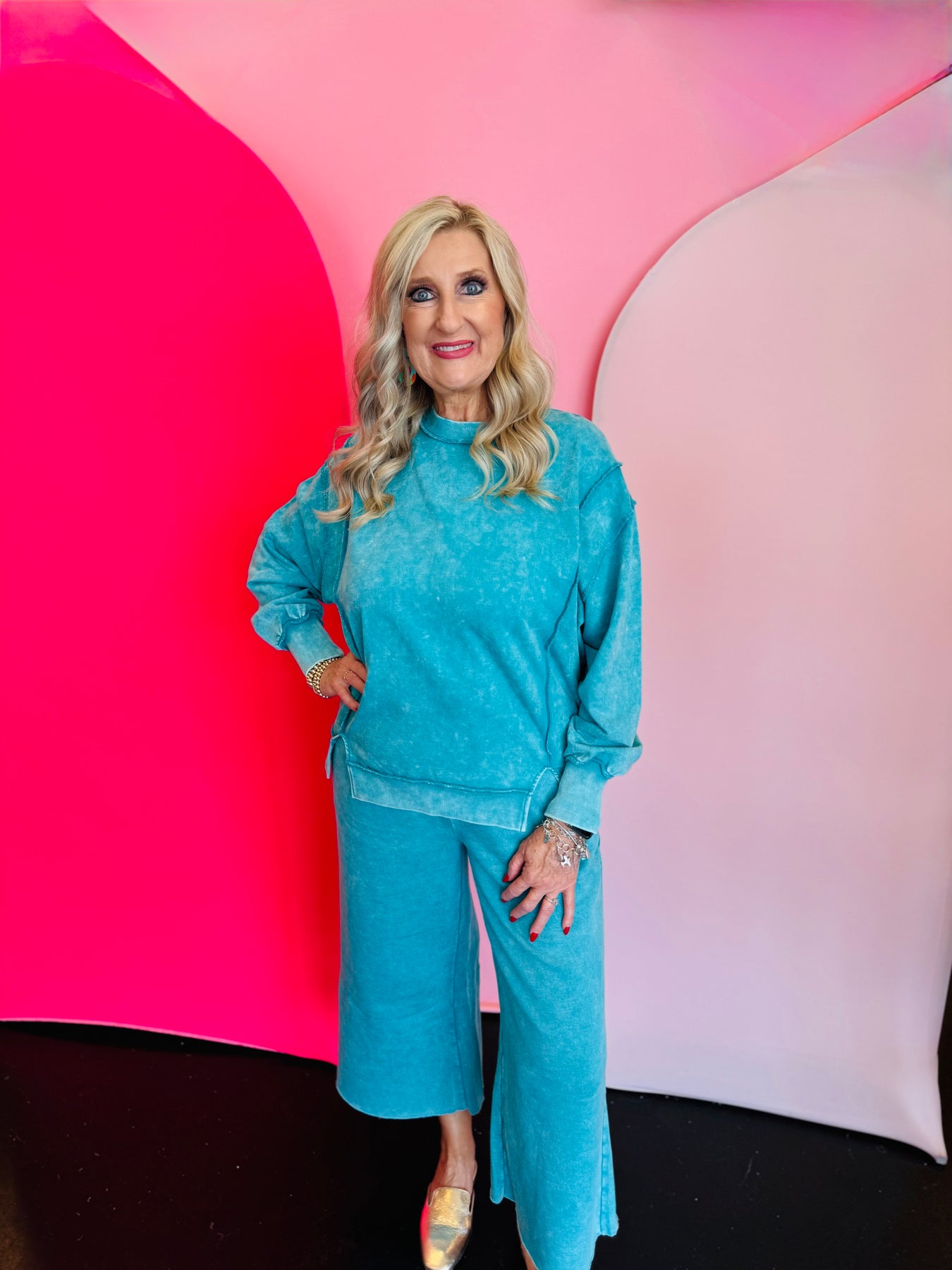 Elevate your casual wardrobe with our Lt Teal Acid Wash Fleece Sweatshirt, offering comfort with an edgy twist. Crafted entirely from soft, breathable 100% cotton French terry, this sweatshirt features a vintage-inspired acid wash paired with trendy exposed seams, creating a lived-in, effortless look. A stylish hi-low hem and a back patch detail add modern structure and texture, making this top perfect for layering over leggings or pairing with your favorite denim. The trim, made from 97% cotton and 3% spandex, ensures subtle stretch and shape retention. With an approximate body length of 26.5” (front) and chest of 48” (measured from S/M), it delivers all-day comfort and on-trend appeal.