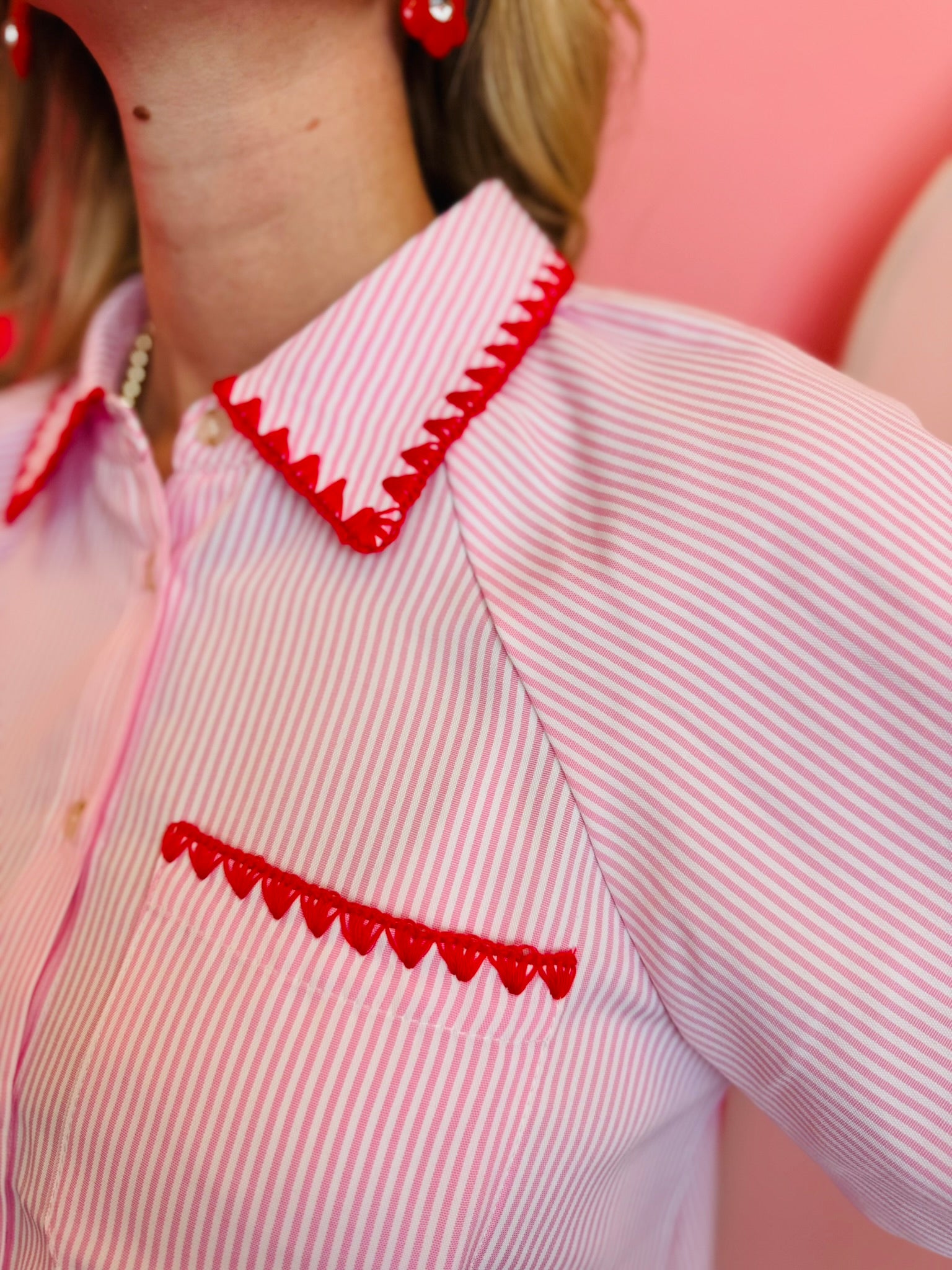 Pink pinstripe button down top with puff sleeves and scallop embroidery