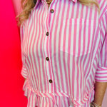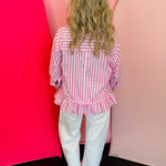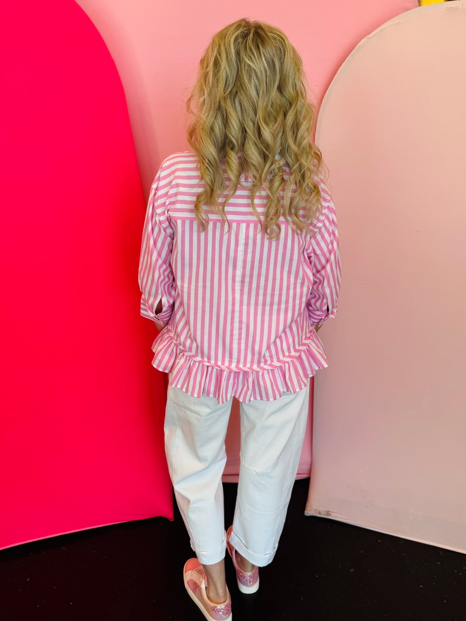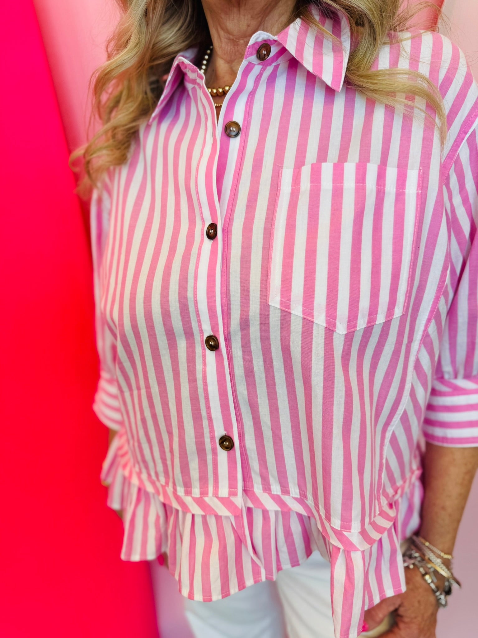 Pink and white striped oversized blouse with button front, chest pocket, and asymmetrical ruffle hem