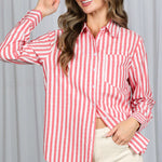 Make a bold, timeless statement with our Red Striped Button Down Shirt, a classic wardrobe essential designed for effortless style and versatility. Crafted from 100% breathable cotton, this long sleeve button-down delivers soft comfort and a crisp, polished look perfect for work, weekends, or layering year-round. The vibrant red and white vertical stripes create a striking contrast that instantly elevates any outfit while subtly elongating the silhouette. With a slightly oversized fit, this shirt offers relaxed ease—perfect for styling tucked into denim, paired with trousers, or worn open over a tank for a casual, chic vibe. Whether you're dressing for the office, brunch, or everyday errands, this striped button-down adds bold color and timeless charm to your wardrobe.