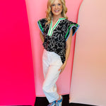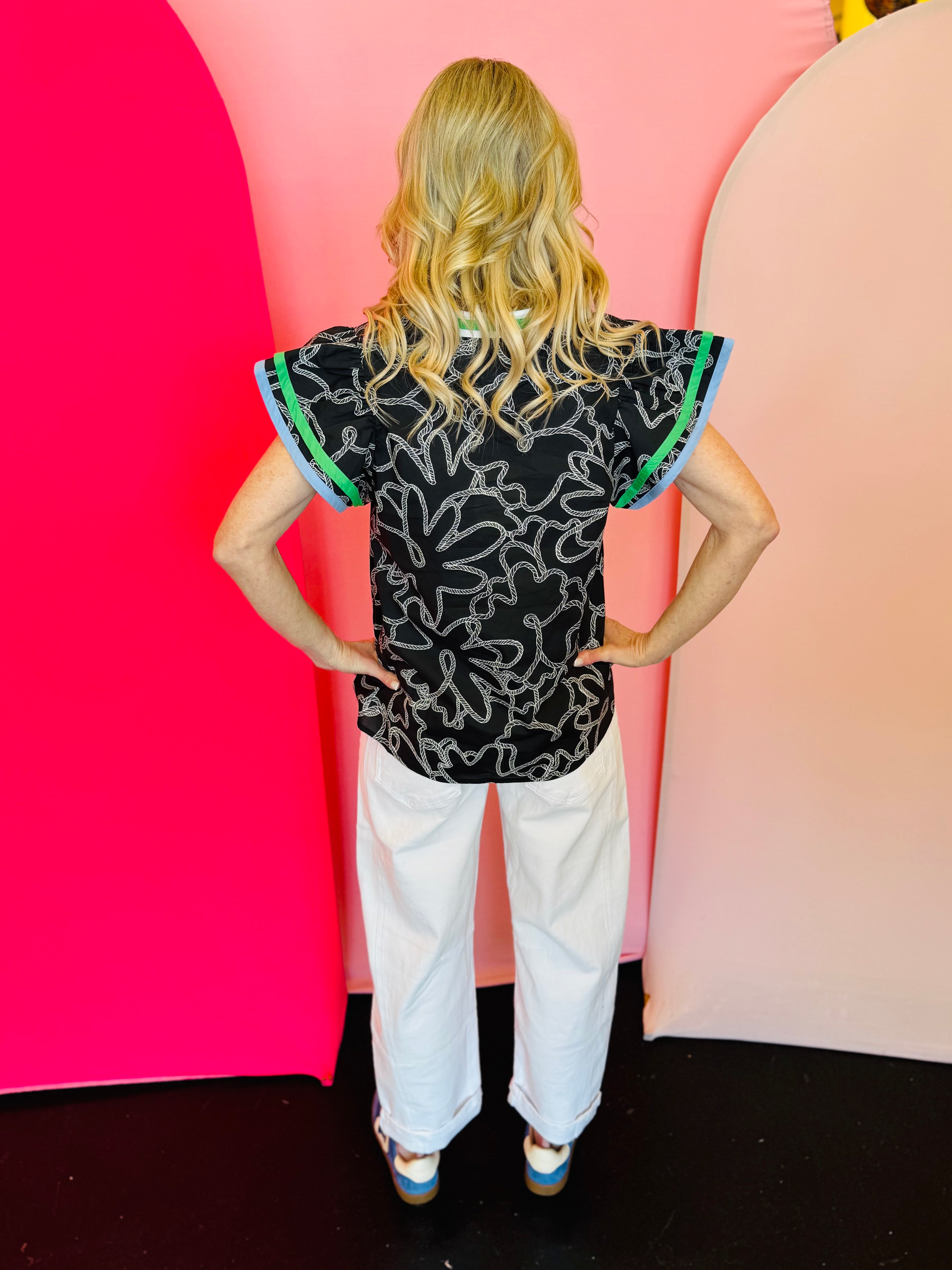 Black abstract print flutter sleeve top with striped V-neck trim and contrast flutter sleeves in lightweight cotton
