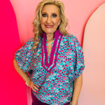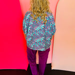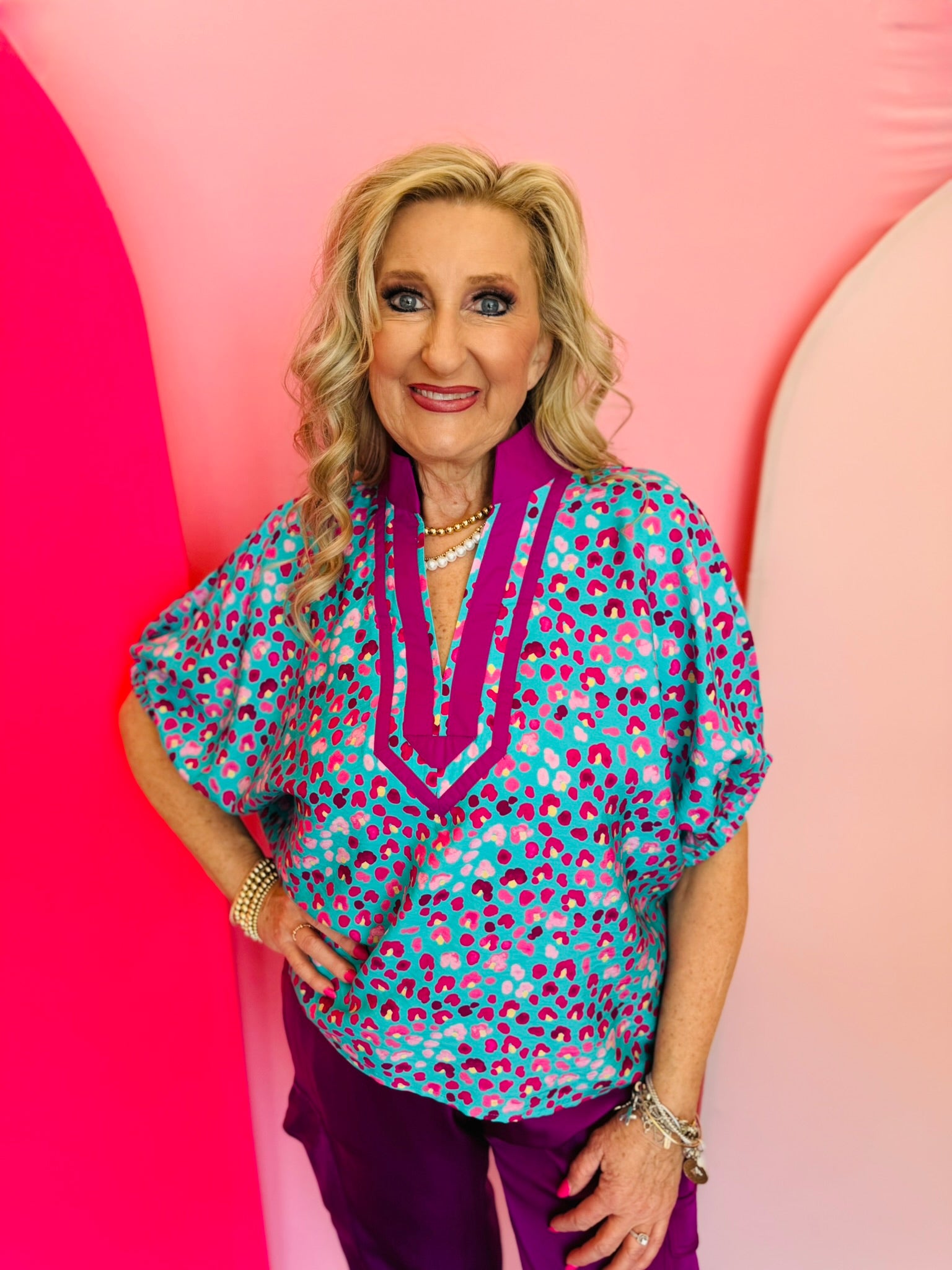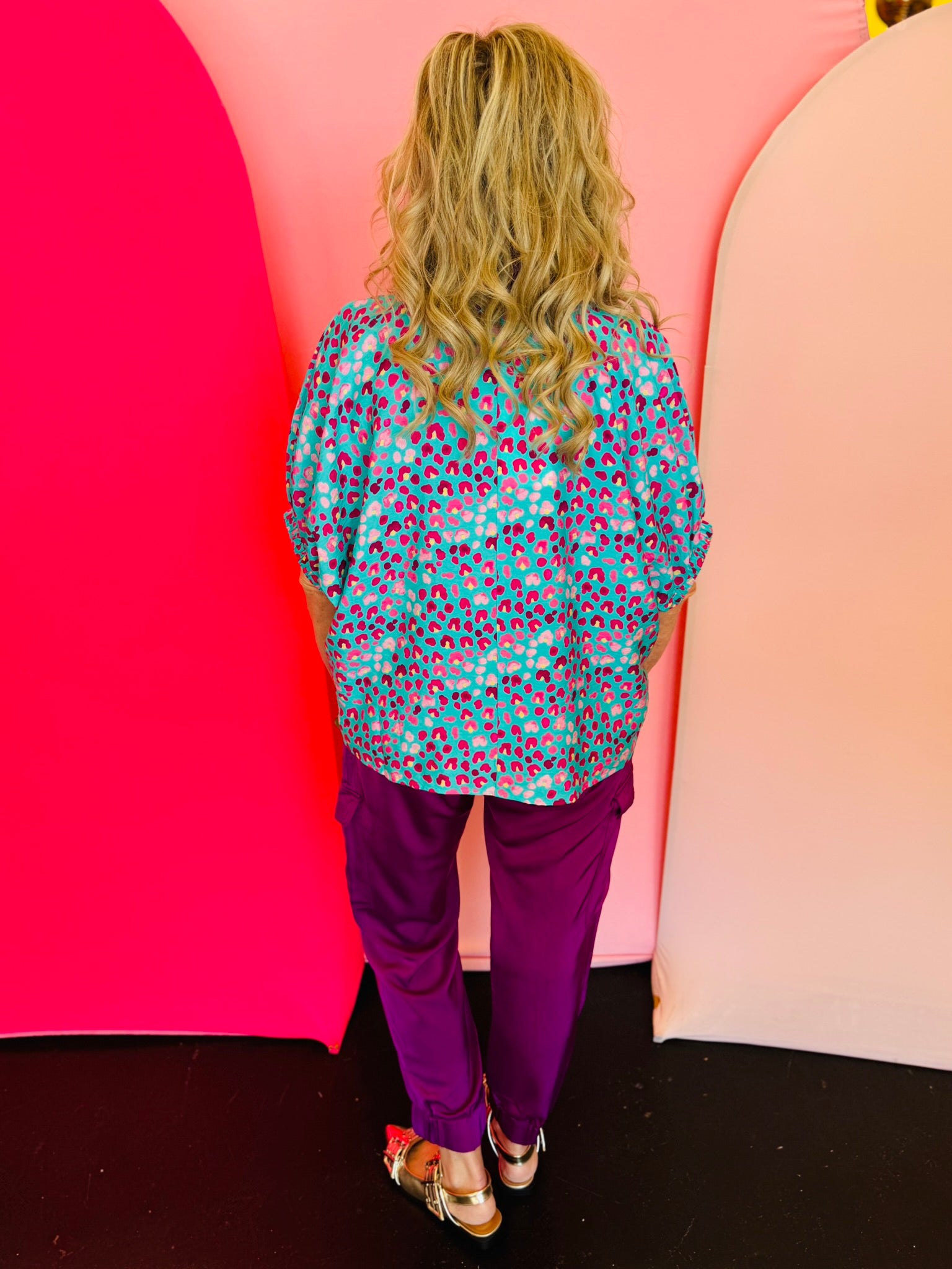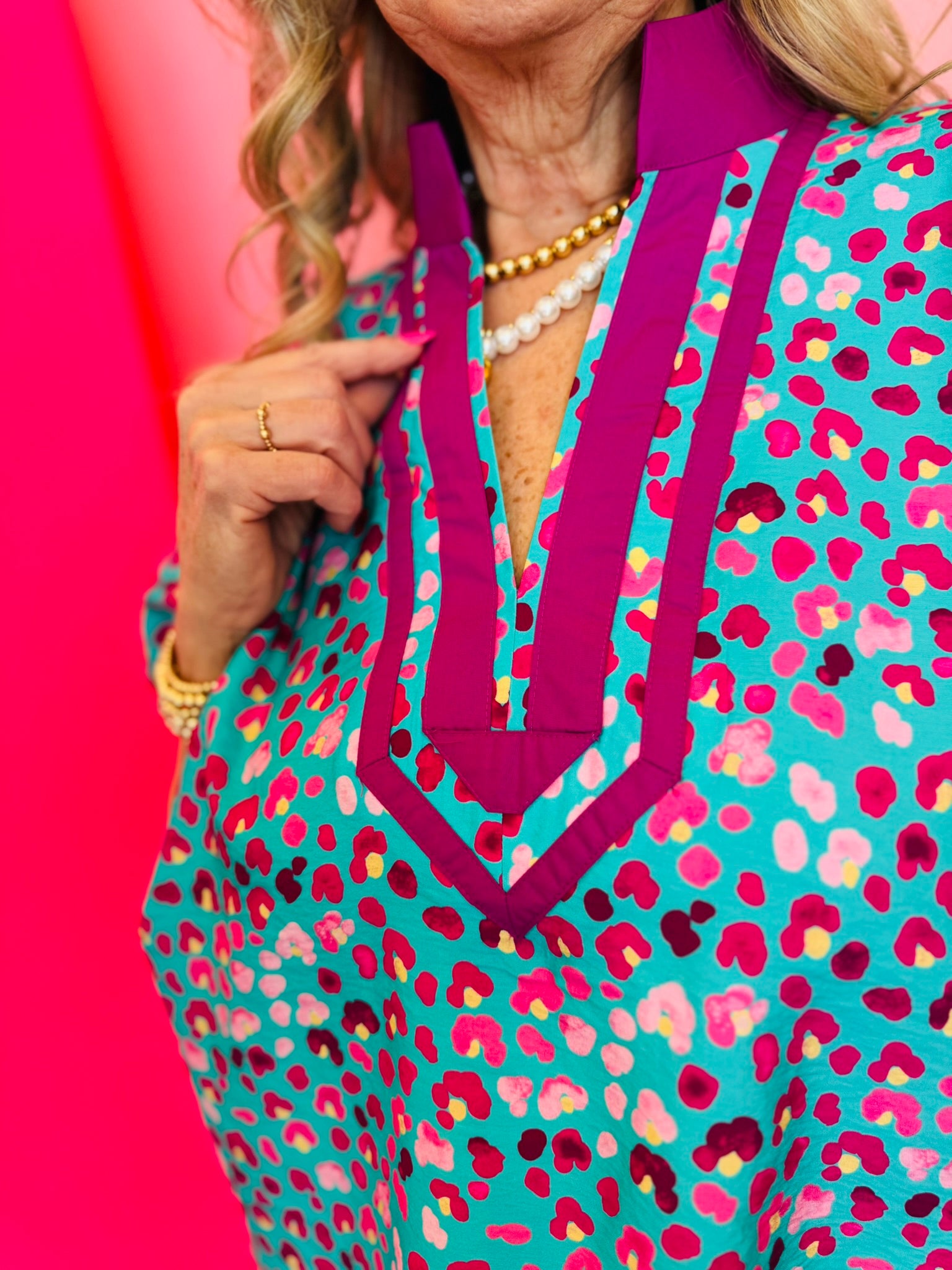 Designed with a striking teal background and a playful magenta leopard print, this top instantly stands out in the best way. The V-neckline features a stand collar accented with contrast trim in rich orchid tones, creating a polished detail that frames the face beautifully.