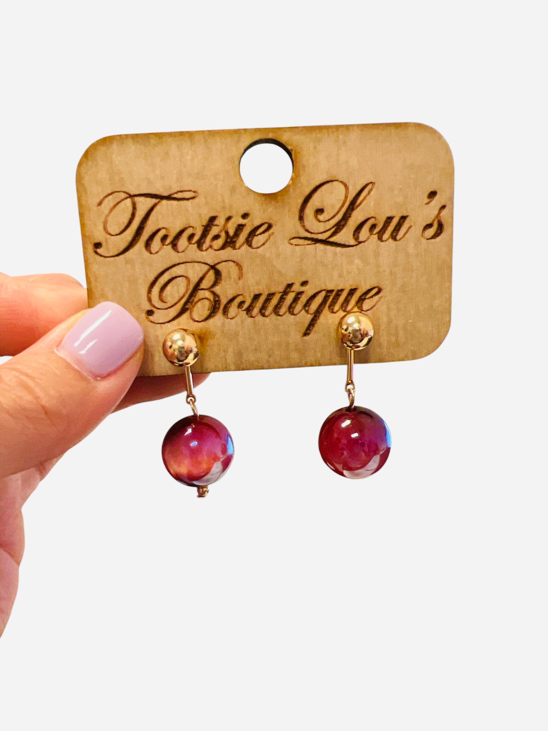 Add a touch of rich elegance to your look with the Burgundy Drop Earrings, a water-resistant design that combines modern sophistication with timeless charm. These stunning earrings feature glossy marbled spheres in deep burgundy tones that delicately dangle from polished gold posts, creating a striking contrast and graceful movement.