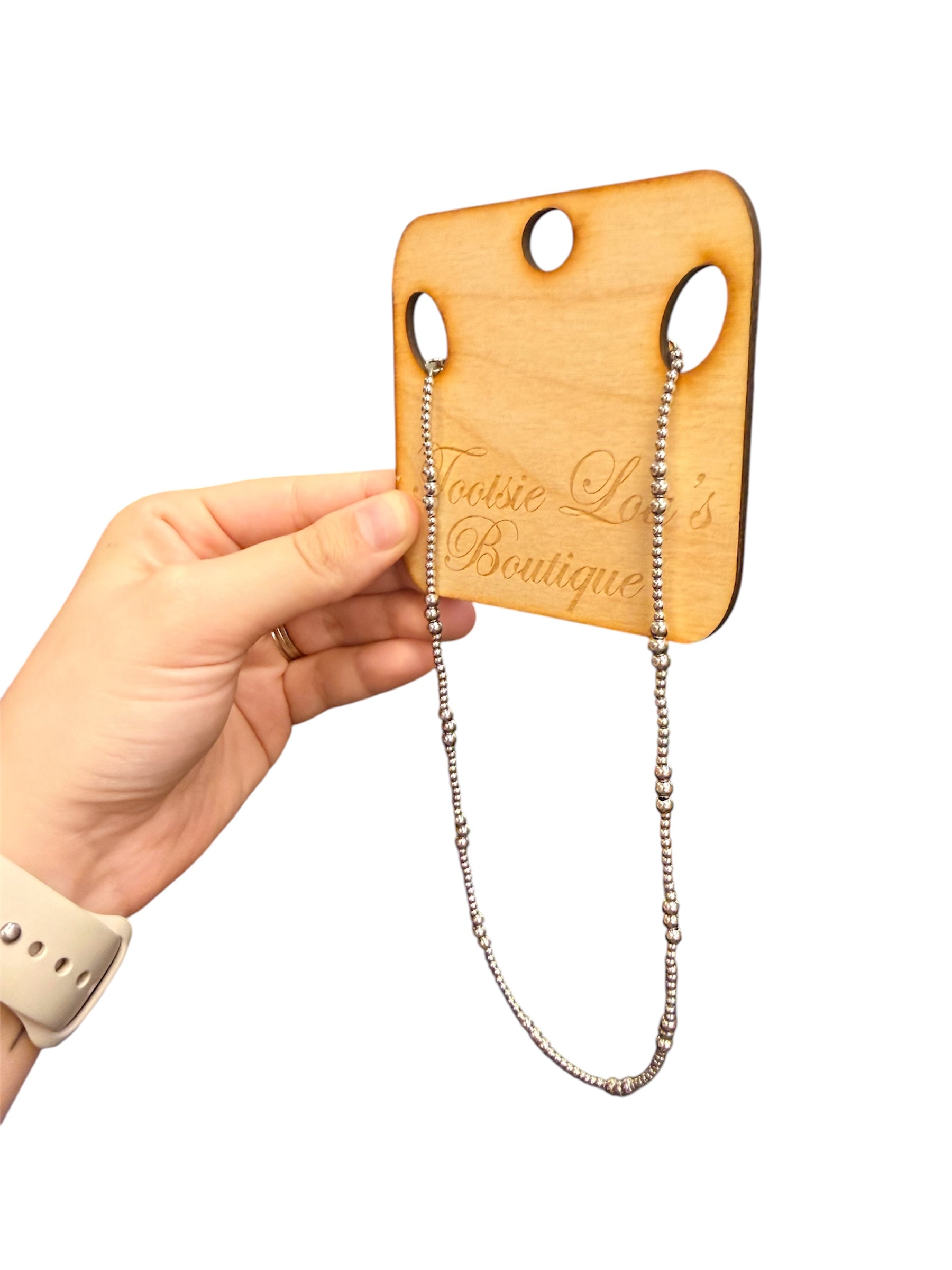 Add timeless elegance to your look with this Delicate Silver Beaded Necklace, a perfect blend of simplicity and shine. The design features a strand of tiny silver beads arranged in a classic, minimal pattern that catches the light beautifully. Throughout the chain, slightly larger silver beads are evenly spaced, adding subtle dimension and texture. Crafted with care, this piece is lightweight, water-resistant, and perfect for everyday wear. Whether you wear it solo for a clean, polished look or layer it with other necklaces for added style, this versatile piece transitions effortlessly from casual to dressy. Durable and dainty, it’s the kind of accessory you’ll reach for again and again.