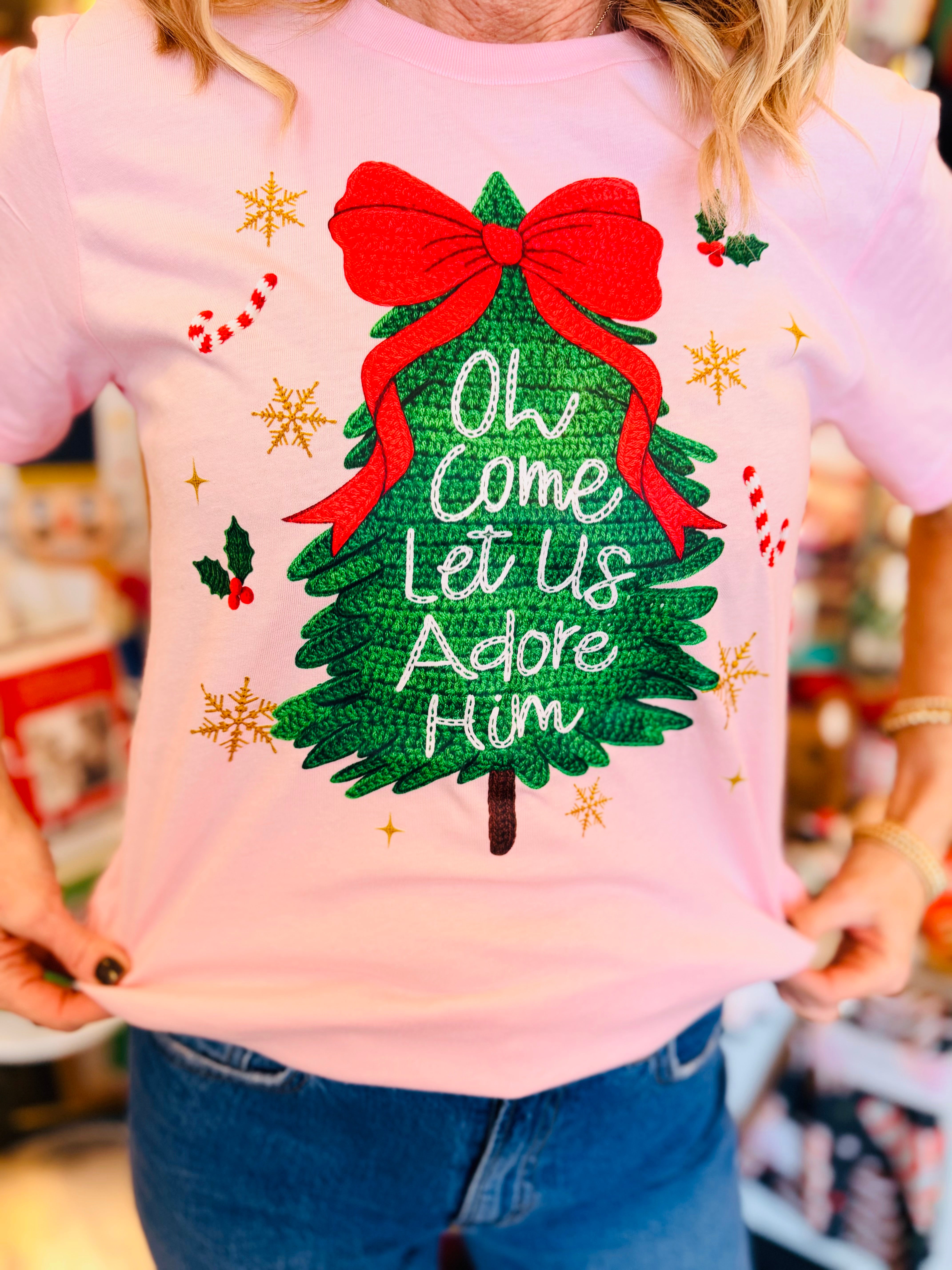 Sweet, festive, and faith-filled—the Adore Him Christmas Tree Tee is the perfect way to celebrate the season in style. This soft pink 100% cotton graphic tee features a charming Christmas tree topped with a sparkling red bow and the heartfelt message “Oh Come Let Us Adore Him” in elegant holiday script.