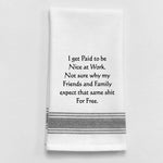 "Make a statement in your kitchen with our I Get Paid To Be Nice Tea Towel. With a white base and black lined trim, this towel serves up some cheeky humor while reminding you of your worth at work. Sure to make your friends and family think twice before expecting your niceness for free."
