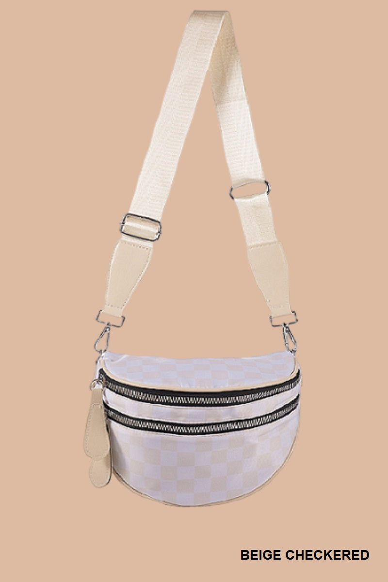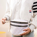 Strut your stuff with our Beige Checkered Double Zip Bum Bag! This sassy little number features vegan leather handles and adjustable straps that let you wear it your way. With double zippers, water-resistant material, and plenty of pockets, it keeps your treasures safe while you're out turning heads. Who knew being practical could look this fabulous? Your adventures just got a stylish upgrade!
