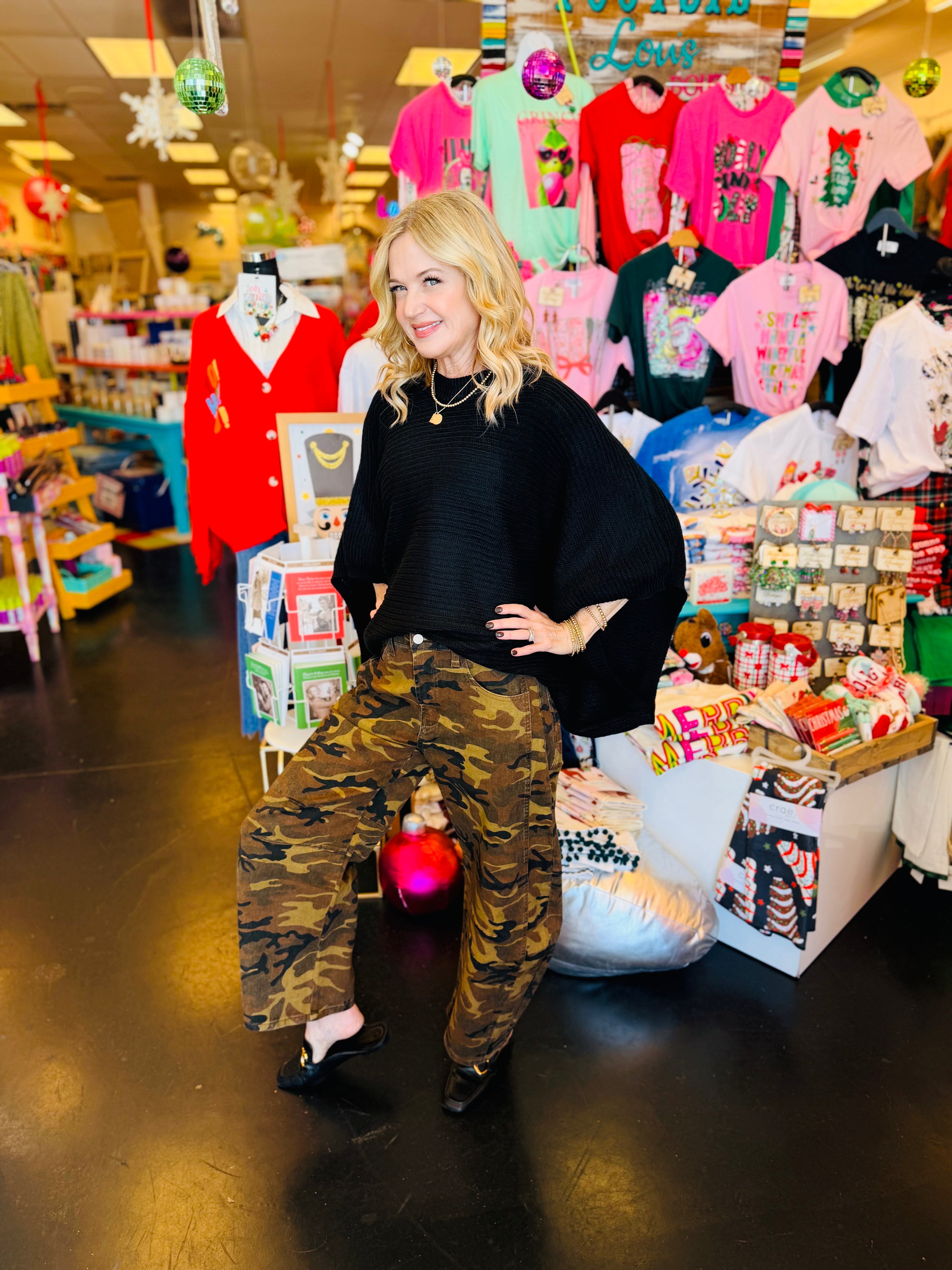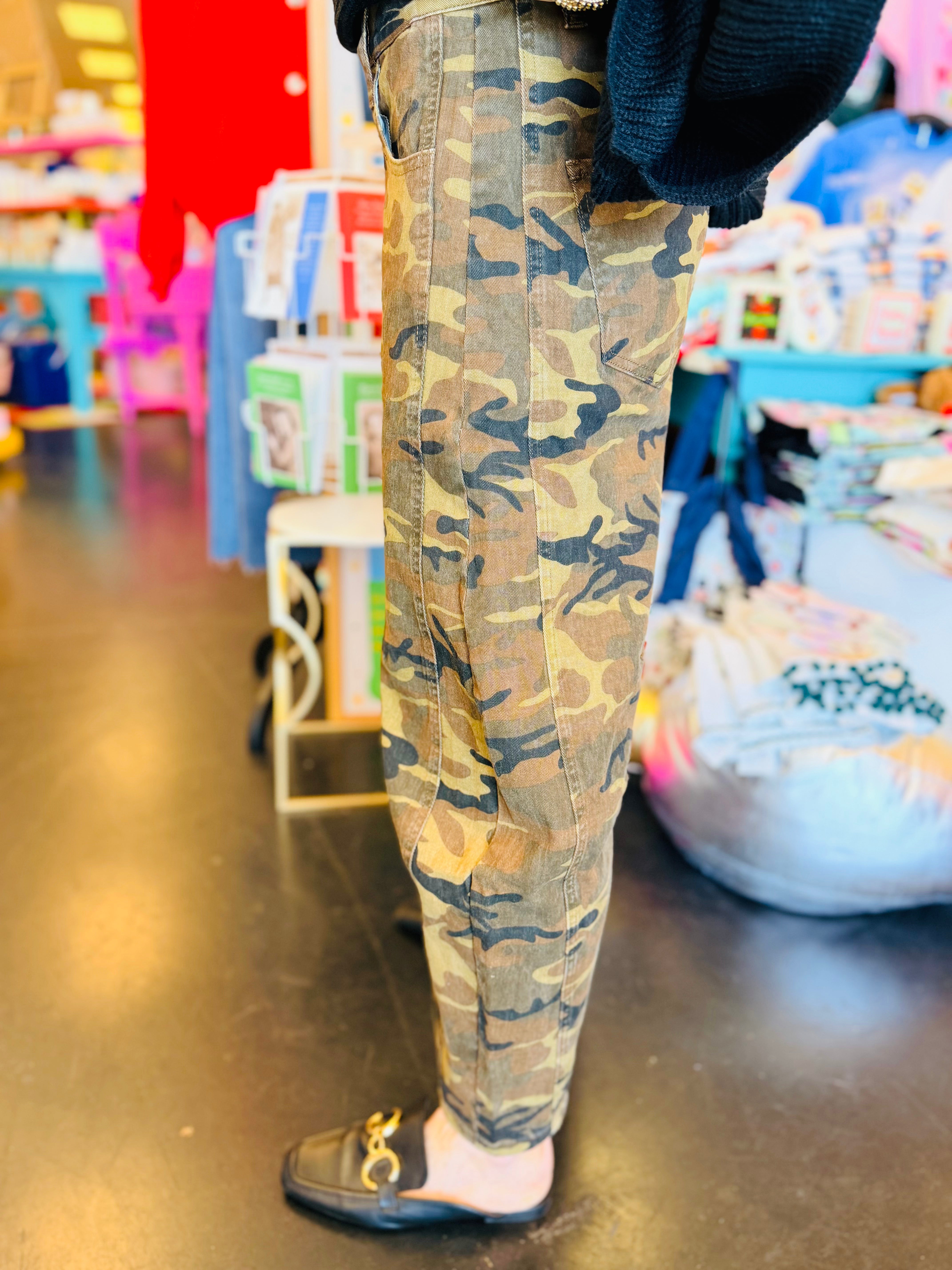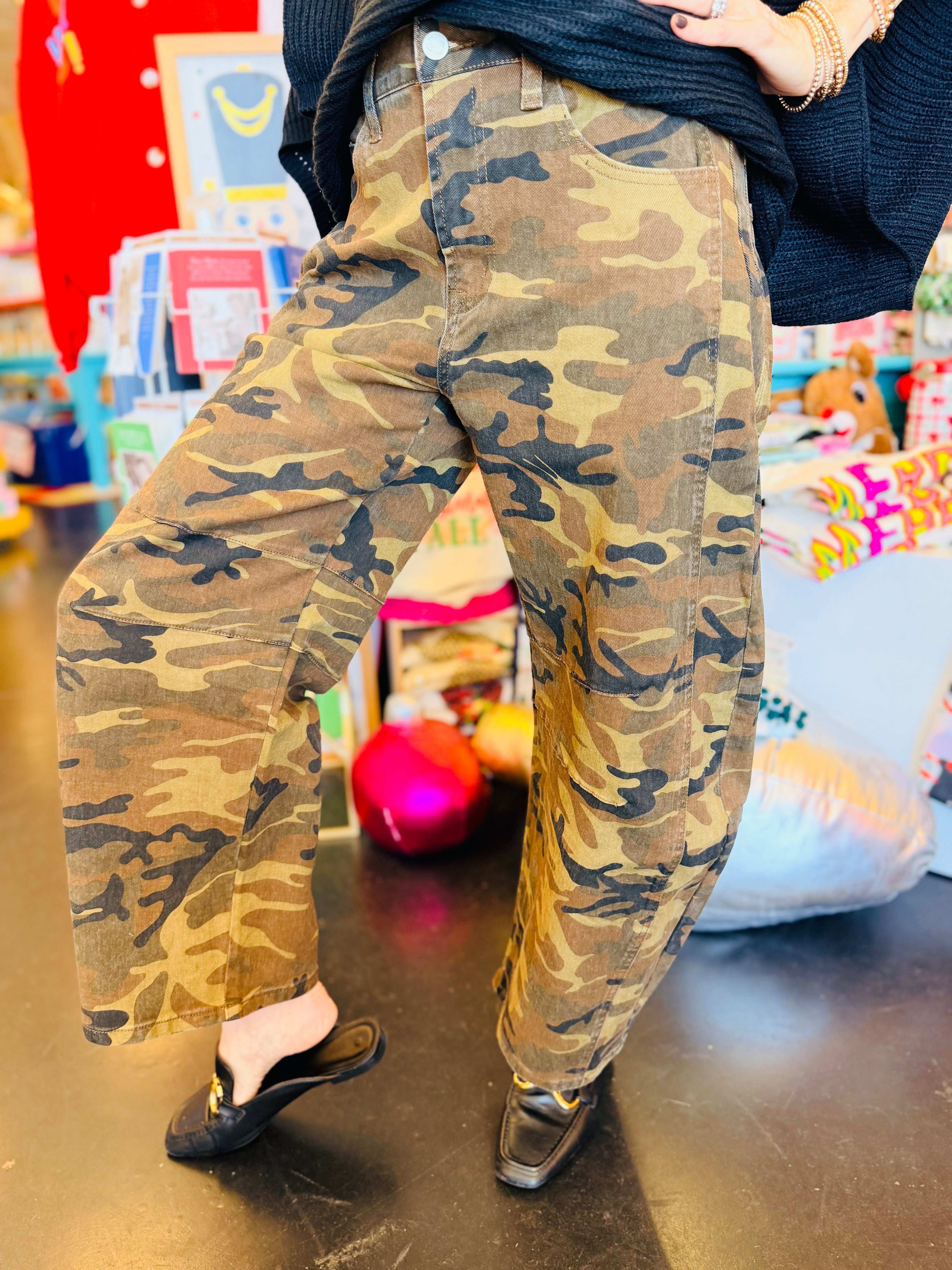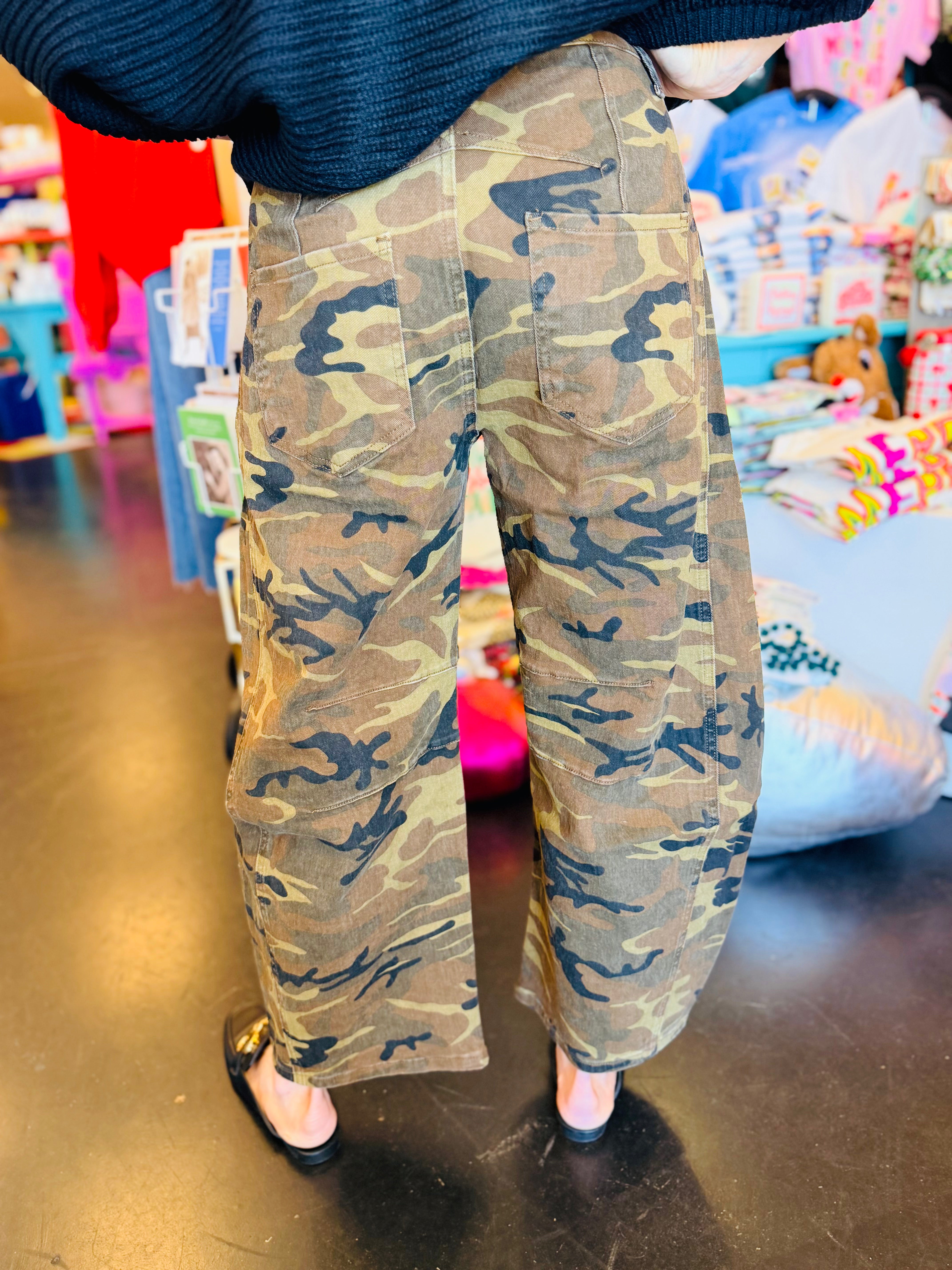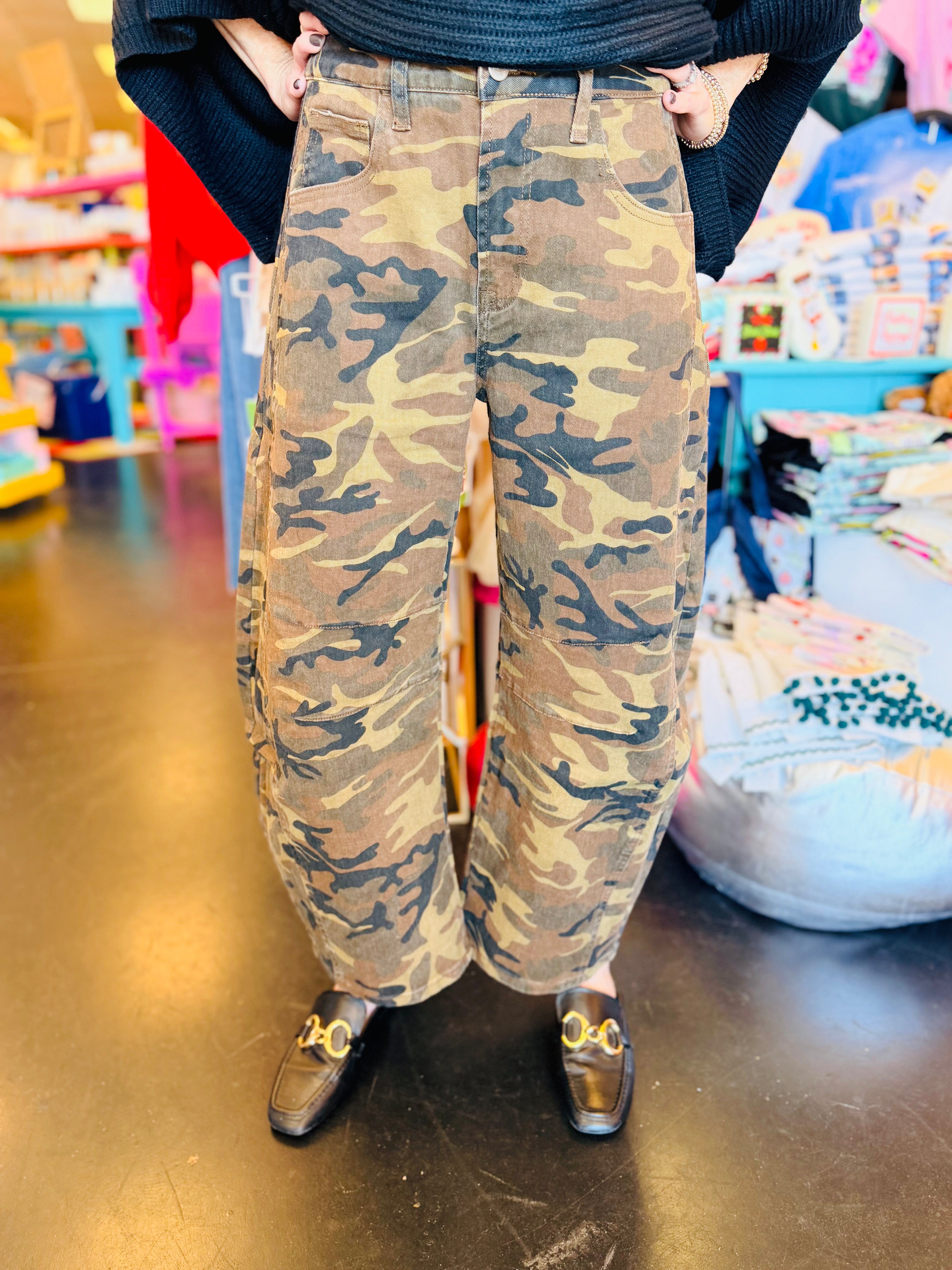 Elevate your casual style with our Camo Barrel Jeans, the perfect blend of trend-forward design and everyday comfort. Crafted from a soft, semi-stretchy denim blend, these jeans offer a flattering mid-rise fit that feels great from morning errands to evening outings. The wide-leg silhouette gently tapers at the ankle, while thoughtfully placed knee darts help maintain that signature “barrel” shape that fashion lovers adore. Detailed side seams and classic belt loops enhance the structured look, giving the jeans a high-quality finish that stands out from the crowd. Whether you pair them with a graphic tee, a fitted top, or a cozy sweater, these Camo Barrel Jeans deliver effortless style with a modern edge.