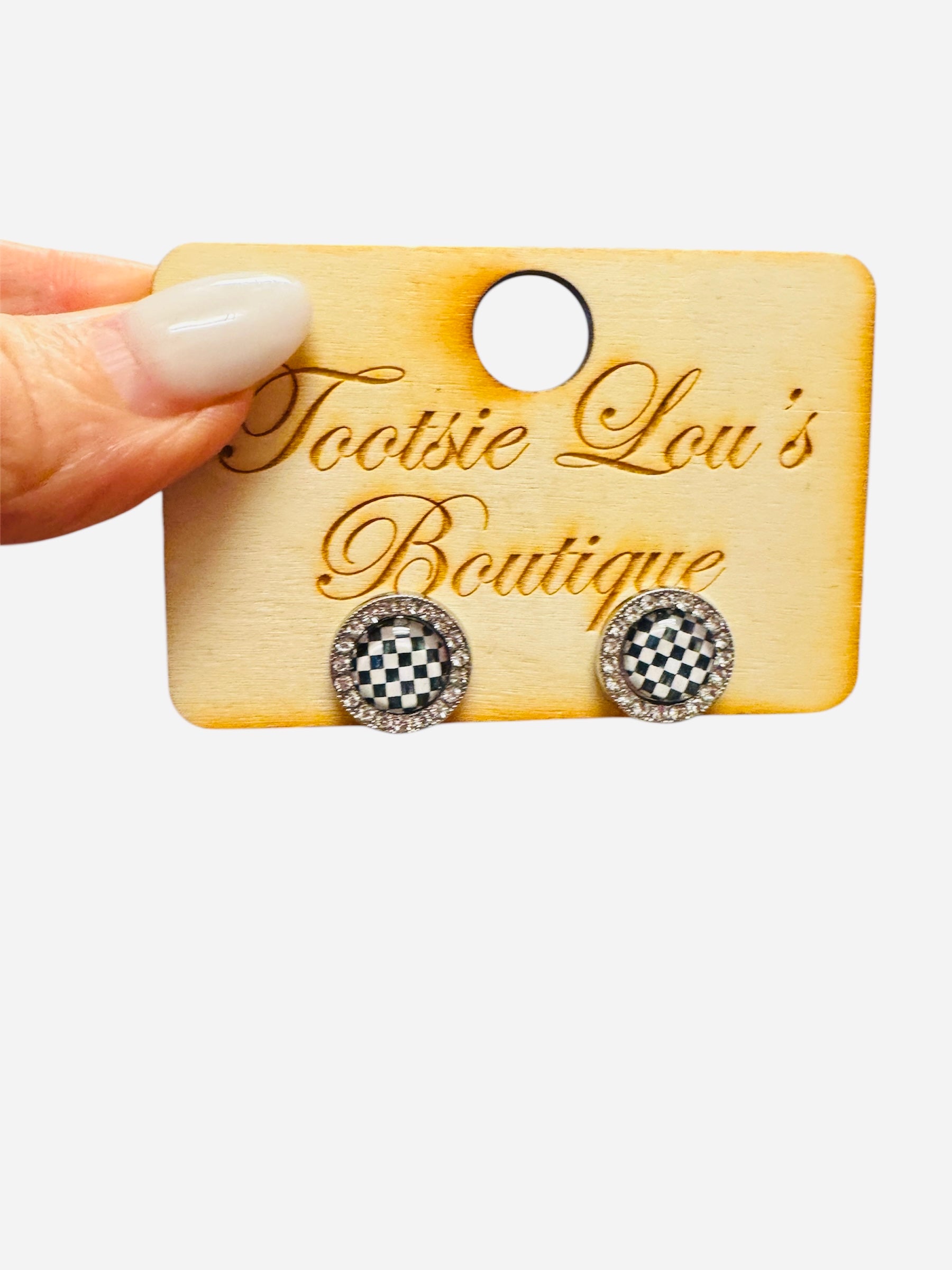Add the perfect touch of sparkle and style to your look with our Black Checkered Rhinestone Stud Earrings, designed to bring bold personality in a chic, compact size. These eye-catching studs feature a classic black and white checkered pattern that adds instant visual interest, making them the ideal accessory for both casual outfits and dressier moments. Each stud is expertly encrusted with shimmering rhinestones, giving them an elevated, glamorous finish that catches the light beautifully from every angle.