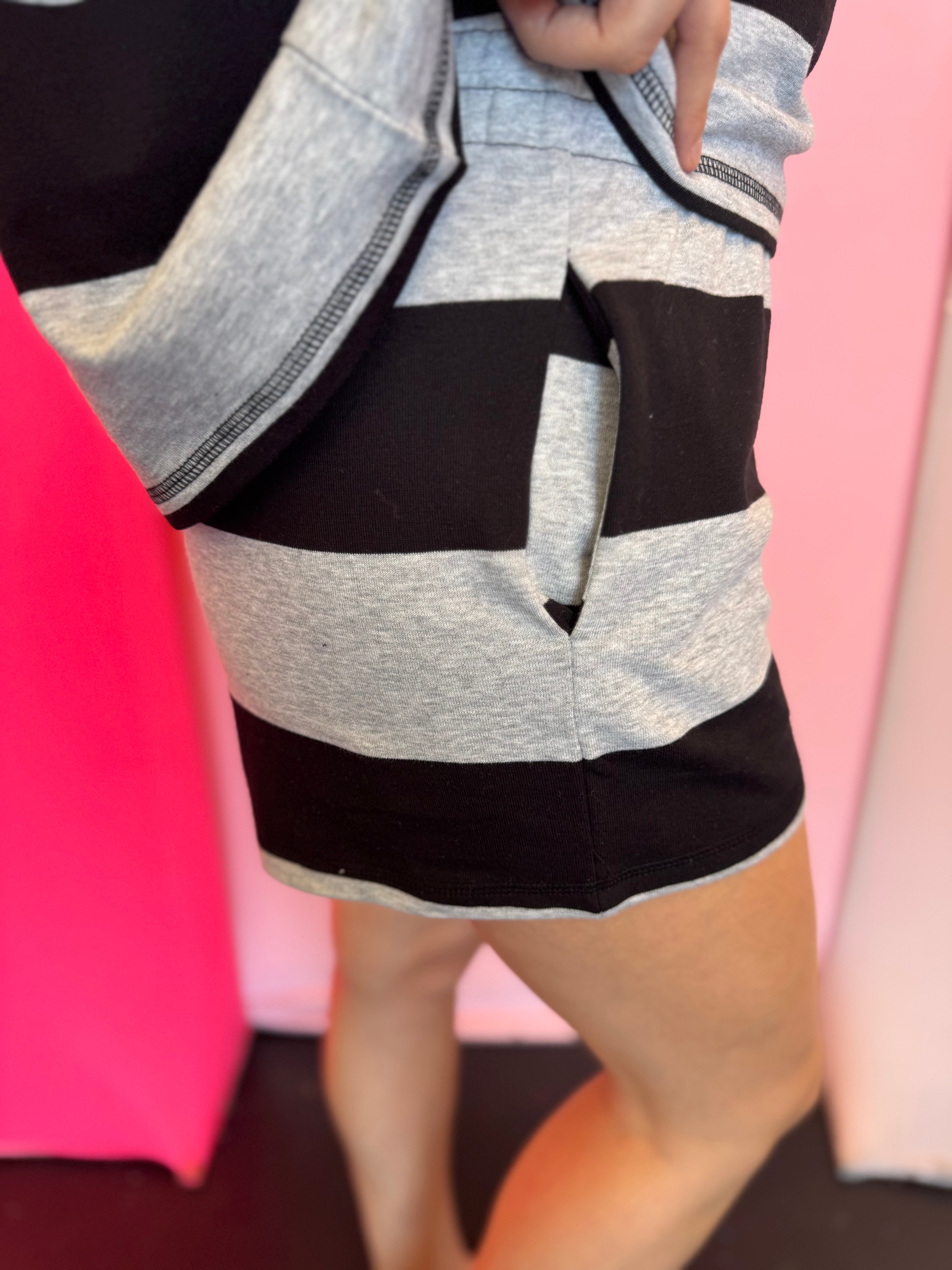 The top features a bold black and grey striped design that makes a statement while still feeling versatile. Designed with wide sleeves and a relaxed silhouette, it gives that laid-back, slightly oversized feel that’s both flattering and on-trend. The functional half-zip neckline adds a sporty touch while letting you adjust your look and comfort throughout the day.
