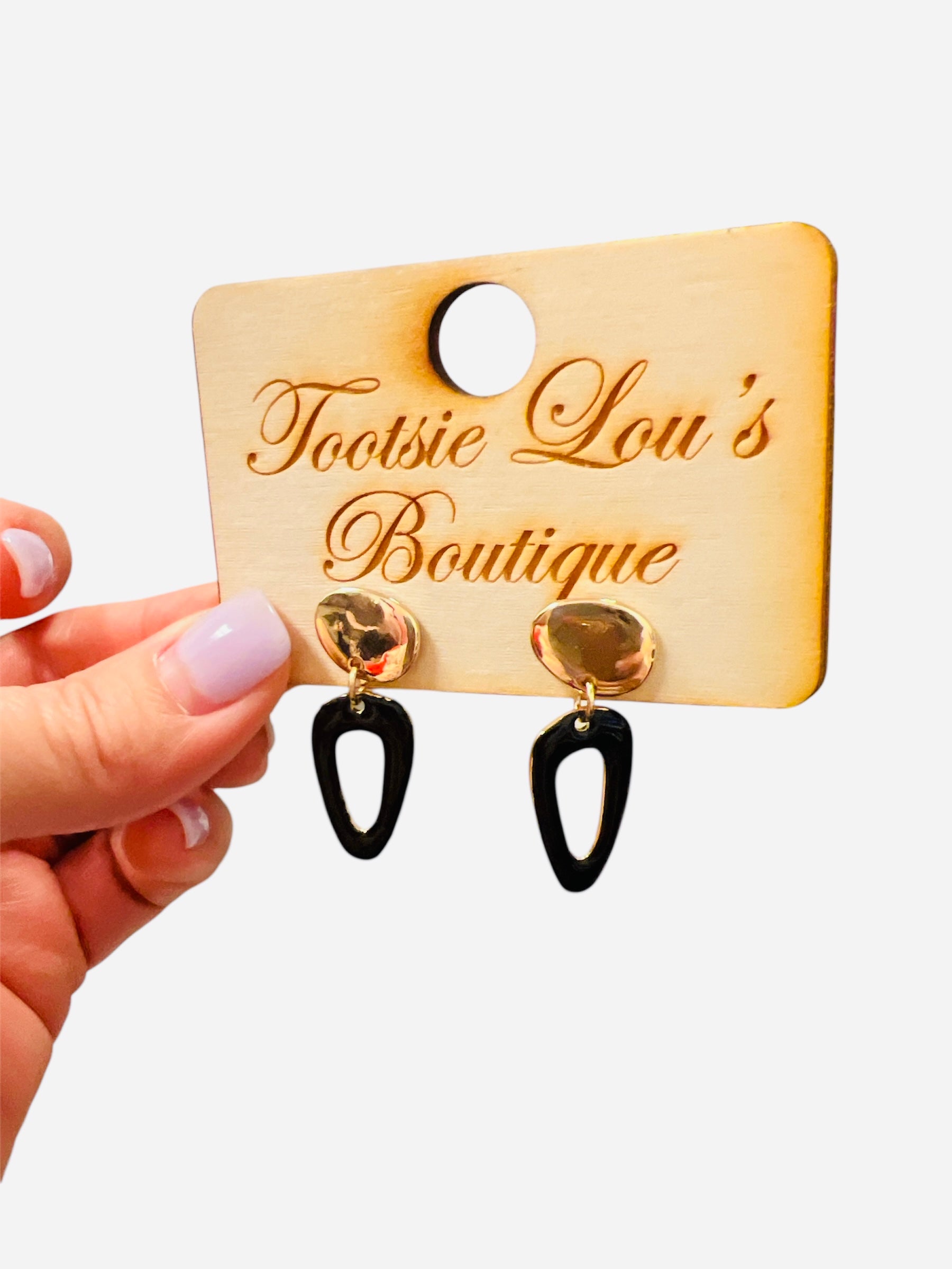 Make a bold, chic statement with the Black Modern Drop Earrings, a sophisticated blend of modern artistry and timeless elegance. These striking earrings feature hammered gold studs that add warm texture and a touch of handcrafted charm. Paired with deep, glossy black abstract drop shapes, they create a stunning contrast that elevates any outfit with minimal effort. The sculptural black drops offer a sleek, contemporary feel—perfect for anyone who loves clean lines, elevated basics, and boutique-inspired jewelry. Lightweight and comfortable enough for all-day wear, these earrings transition seamlessly from office hours to evening events. Style them with blouses, sweaters, blazers, or dresses for an instantly polished look. Effortless, elegant, and versatile, they’re a must-have accessory for any jewelry lover.