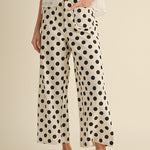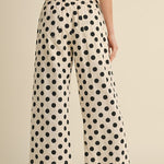 Elevate your everyday style with the Black Polka Dot Wide Pants, a timeless blend of playful pattern and effortless sophistication. Featuring a chic white base with black polka dots, these wide-leg pants offer a flattering, flowy silhouette perfect for both casual and dressy occasions. Designed with a hidden zipper closure, back stretch waistband, and side and back pockets, they combine tailored polish with everyday comfort. Crafted from a breathable cotton-rayon-linen blend, these pants move beautifully while keeping you cool and comfortable all day long. Pair them with a crisp blouse or fitted tee for an effortlessly put-together look.