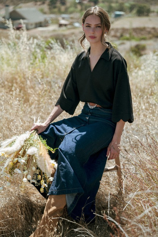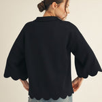 Effortlessly chic, the Black Scallop Top is a timeless wardrobe essential that pairs classic design with feminine detail. Crafted from a soft, lightweight blend of rayon, polyester, and spandex, this top offers the perfect balance of comfort and stretch. It features a flattering V-neckline framed by a subtle collared detail and elegant scalloped edging along the neckline and hem for a polished finish. The 3/4 sleeves add versatility, making it ideal for year-round wear — perfect for pairing with jeans, trousers, or skirts for a sophisticated, put-together look that transitions seamlessly from work to weekend.