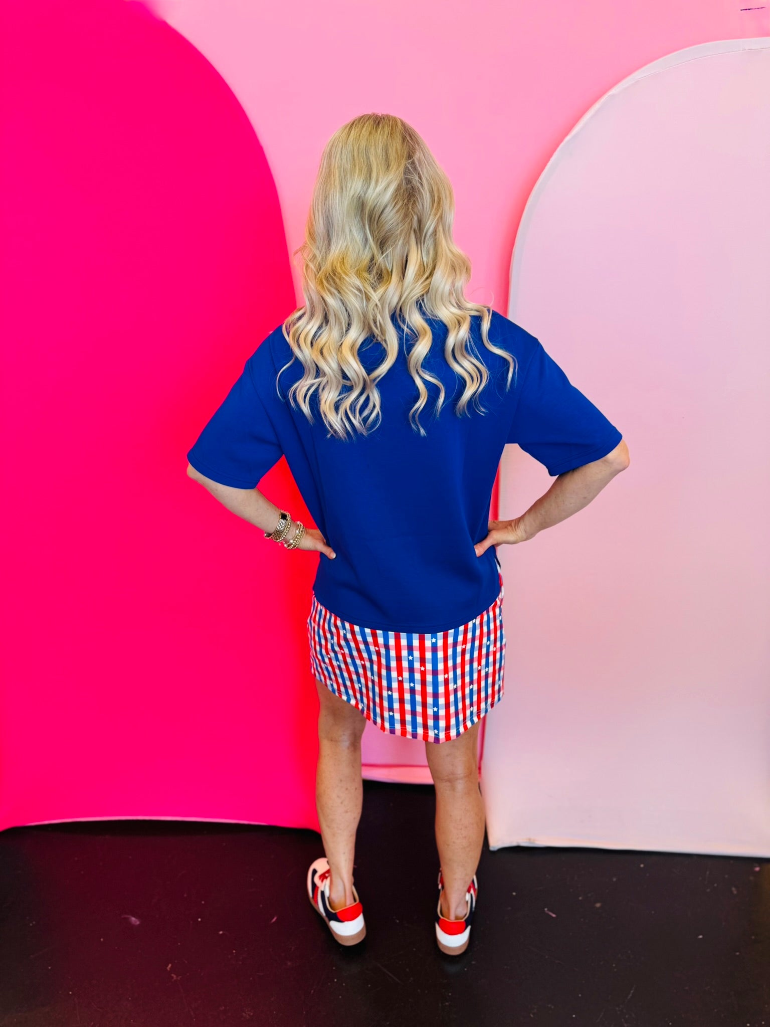 Sweet, patriotic, and effortlessly cozy, the Blue Gingham Glory Bow Tee is the statement piece your wardrobe didn’t know it needed. Featuring a rich dark blue base, this top is elevated with a standout patriotic gingham bow patch front and center, finished with crisp white trim for a polished, boutique-inspired look.