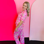 Cozy up in festive style with the Bow Christmas Treat Ruffle Pajama Set, the perfect blend of comfort and holiday cheer. This two-piece set features a bright pink background covered in playful Christmas tree treats topped with pink bows and sprinkled with white snowflakes, adding a whimsical touch to your winter nights. The short-sleeve, button-down top pairs effortlessly with matching drawstring pants, both trimmed with subtle ruffle accents for a feminine finish.