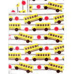 Features yellow school buses, red stop signs, and gray stripes