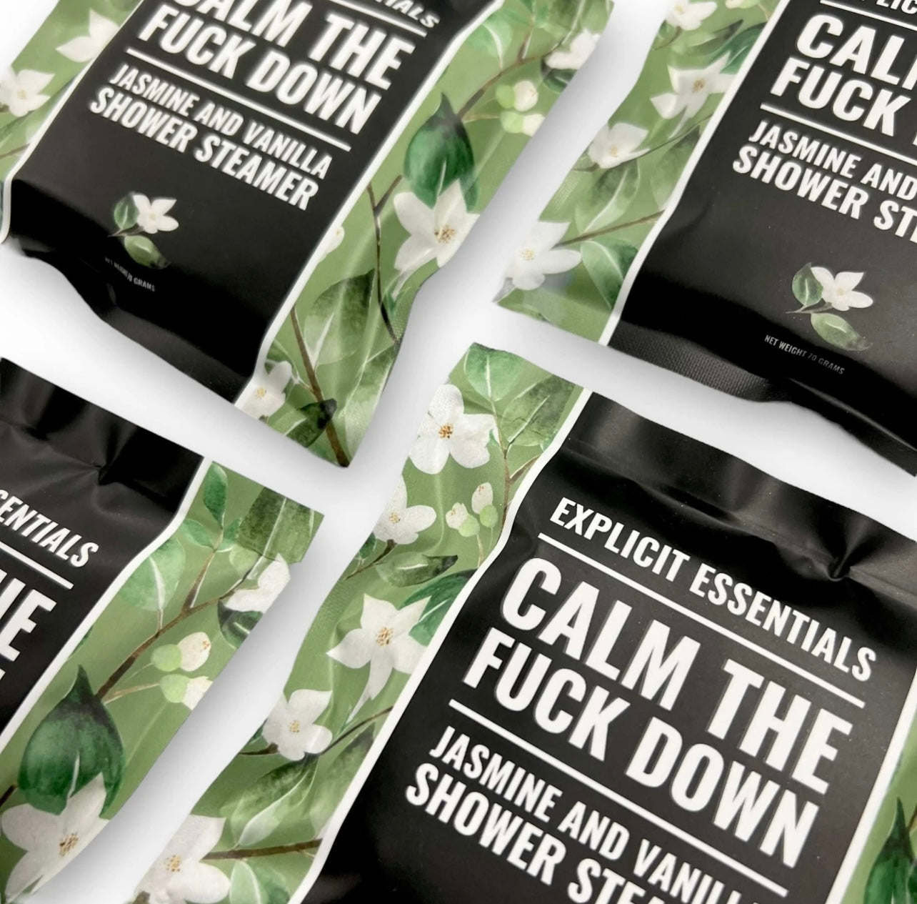 Take a deep breath and Calm The Fuck Down with our soothing shower steamers, your daily dose of calm in a chaotic world. Infused with the gentle floral aroma of jasmine and the comforting warmth of vanilla, these aromatherapy shower steamers transform your shower into a stress-relieving retreat that melts away tension and resets your mood. Each steamer dissolves slowly in the steam, releasing a luxurious scent that fills the air and soothes your senses. Made with premium, cruelty-free ingredients, this women-owned and operated brand ensures high quality with every use. Perfect for self-care, gifting, or simply surviving the week — these Calm TF Down Shower Steamers turn your shower into the peaceful escape you deserve.
