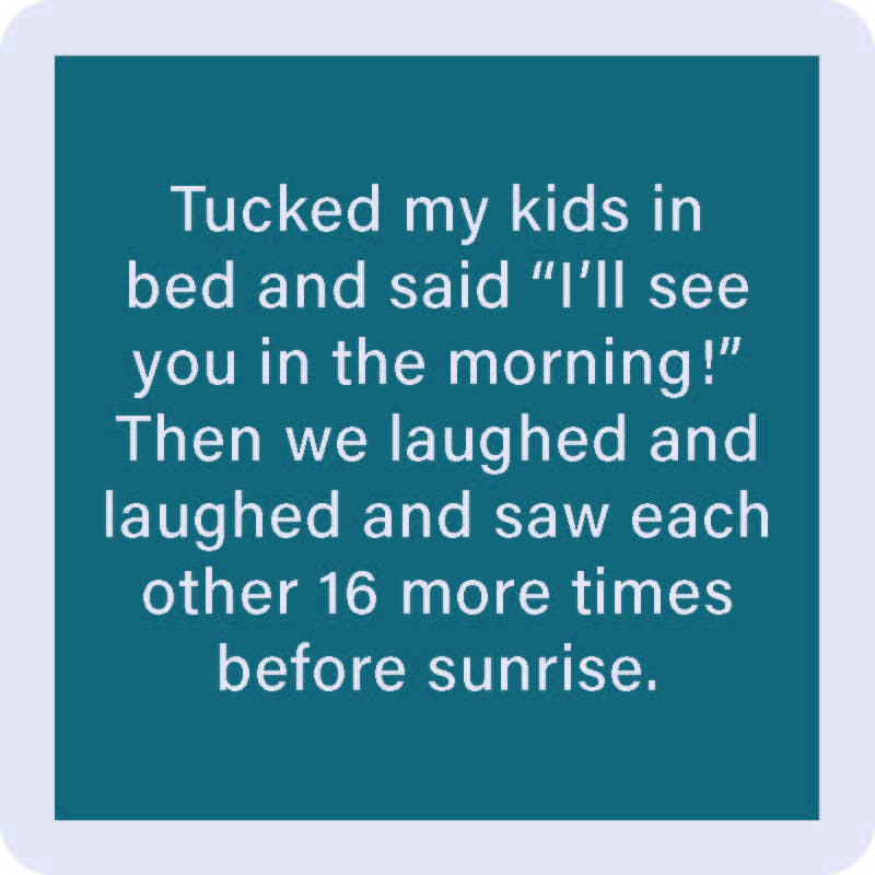 - Features the quote about “seeing the kids 16 more times before sunrise”