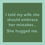 - Features the hilarious phrase: “I told my wife she should embrace her mistakes… she hugged me.”
